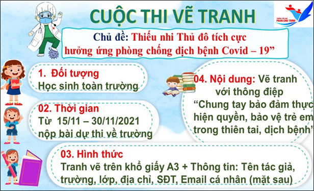 Thực hiện Công văn số 431/KH-SVHTT ngày 08/11/2021 của Sở Văn hóa và Thể thao, Liên Đội trường TH Phan Chu Trinh phát động tới học sinh toàn trường cuộc thi vẽ tranh “Thiếu nhi Thủ đô tích cực hưởng ứng Phòng chống dịch bệnh Covid-19”.