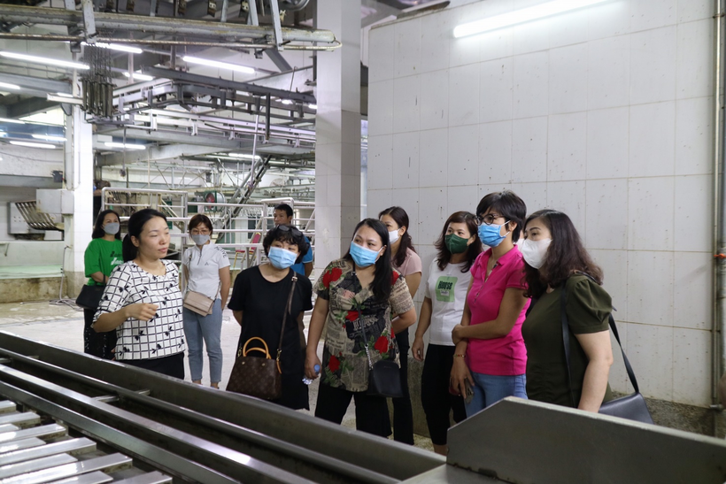 Bà Hoàng Thị Lan Hương tiếp tục dẫn đoàn vào thăm dây chuyền mổ lợn, gà… mỗi khu vực sản xuất đều được đoàn xem xét, quan sát kĩ lưỡng kết hợp với việc trao đổi với công nhân, cán bộ quản lý để hiểu và đánh giá về mức độ tin tưởng đối với công ty.