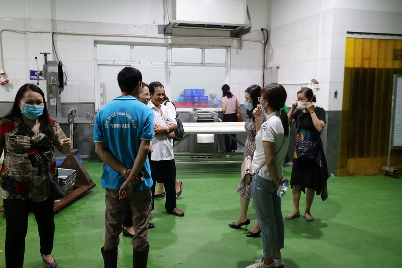 Rời nơi cung cấp rau xanh, đoàn đến địa điểm thứ hai, nơi cung cấp thịt tươi sống cho Công ty Hải Đăng. Nằm trên địa bàn Cụm công nghiệp Hà Bình Phương – Văn Bình – Thường Tín – Hà Nội, Công ty cổ phần Công nghệ thực phẩm Vinh Anh có quy mô lớn, khá hiện đại. Tại đây, đoàn gặp gỡ lãnh đạo của Công ty, xem video giới thiệu về hoạt động sản xuất, trao đổi kĩ về quy trình hoạt động, việc đảm bảo vệ sinh, an toàn thực phẩm, truy xuất nguồn cung.