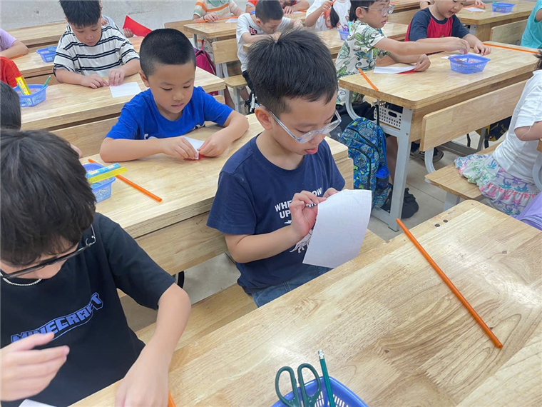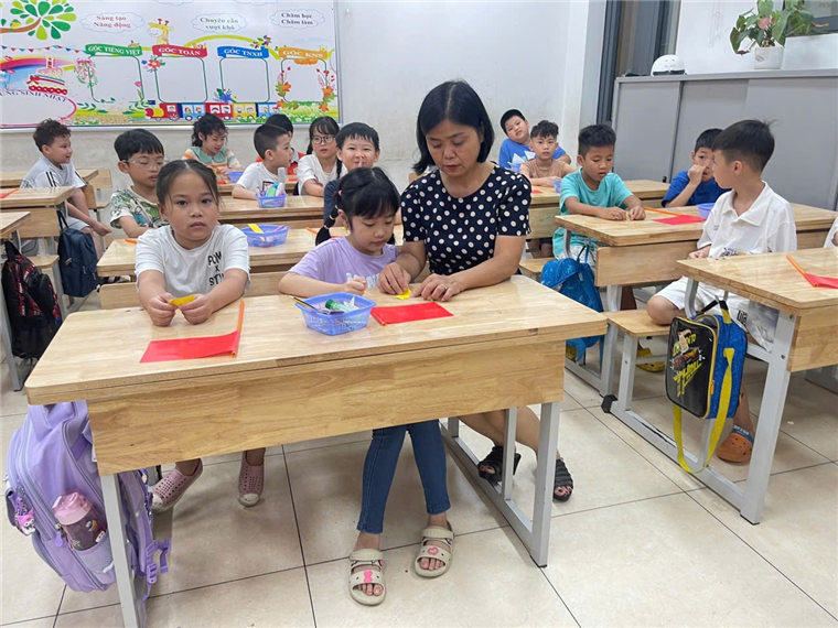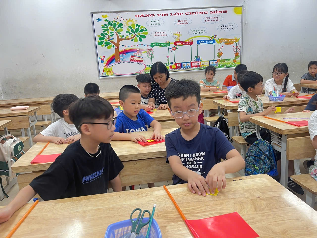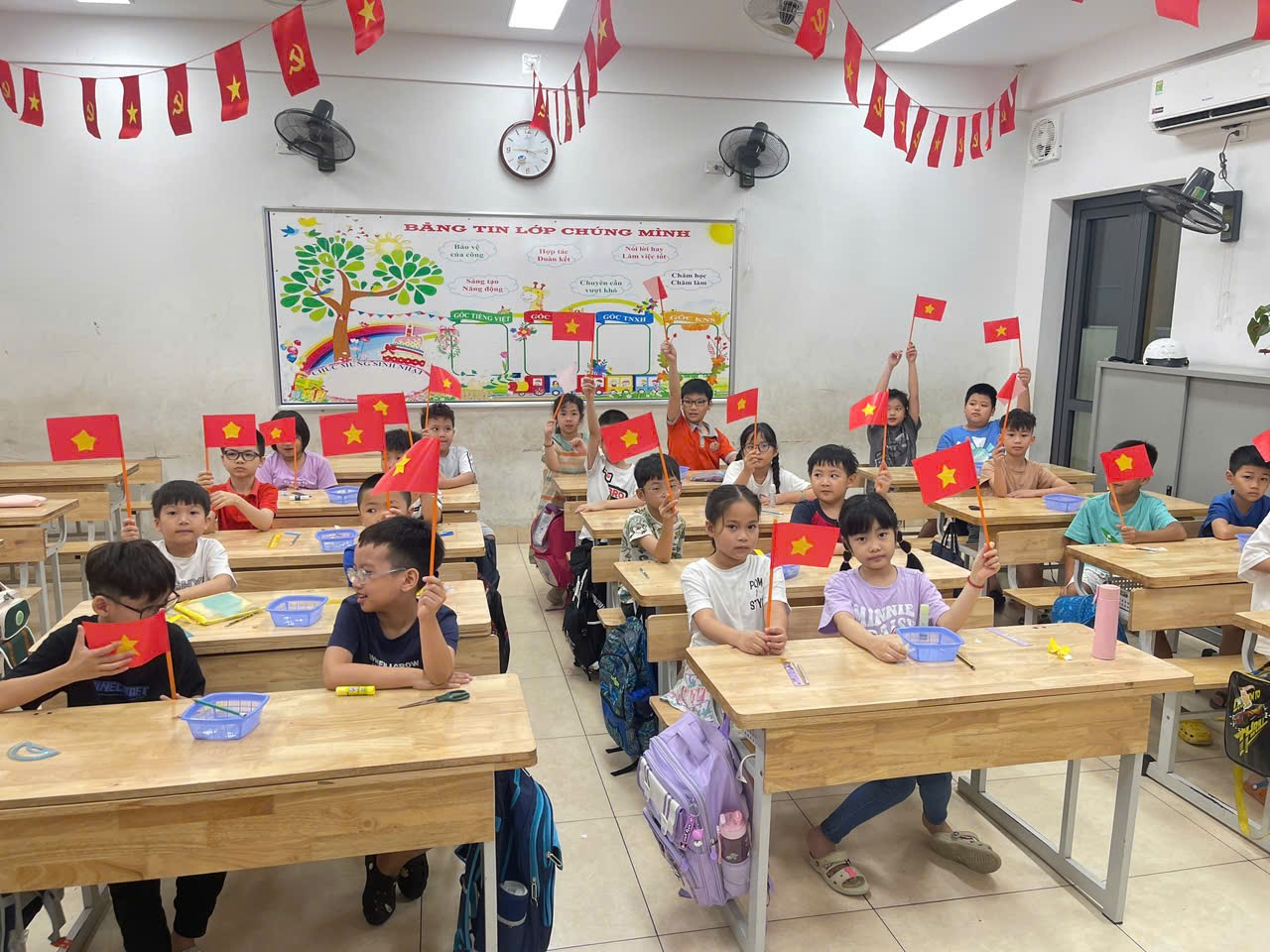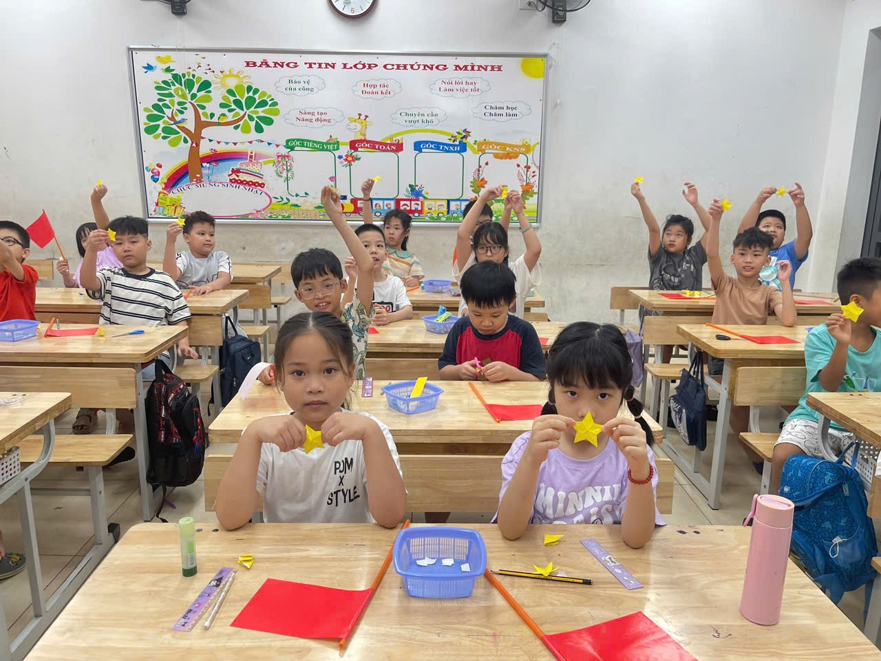 Với bàn tay nhỏ xinh và trí tưởng tượng phong phú, các em đã biến những tờ giấy màu, những mẩu hồ dán thành những lá cờ đỏ sao vàng. Đây không chỉ là một hoạt động trải nghiệm đơn thuần, mà còn là dịp để các em tìm hiểu về ý nghĩa thiêng liêng của quốc kỳ Việt Nam. Hình ảnh ngôi sao vàng năm cánh trên nền cờ đỏ thắm đã trở nên gần gũi và sống động hơn bao giờ hết, gắn liền với những câu chuyện về lịch sử hào hùng của dân tộc.
