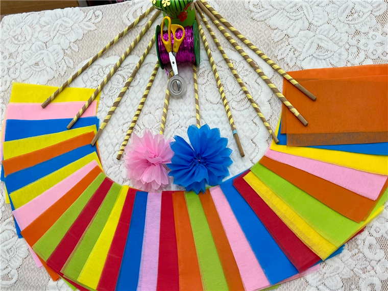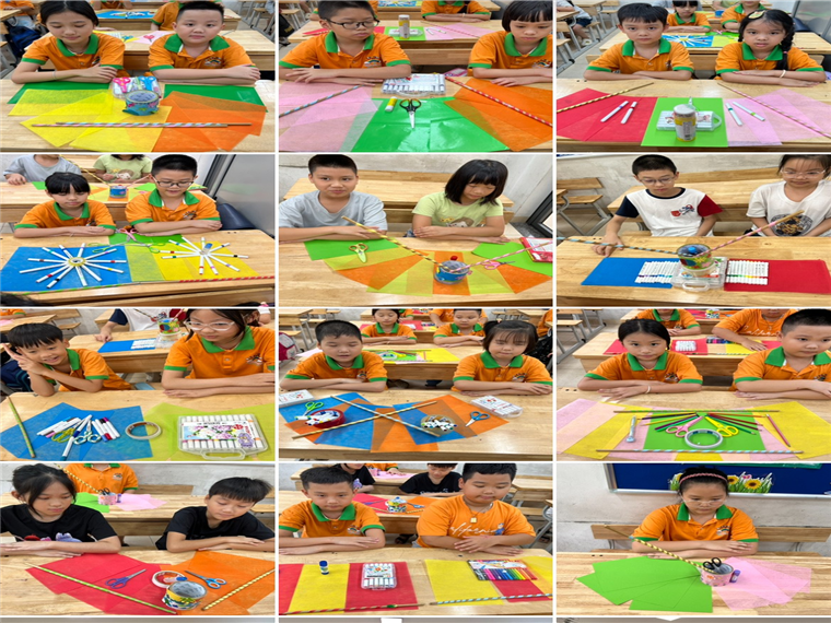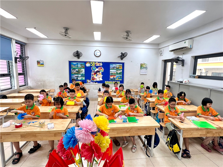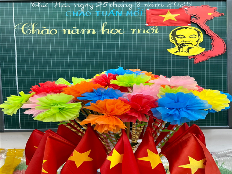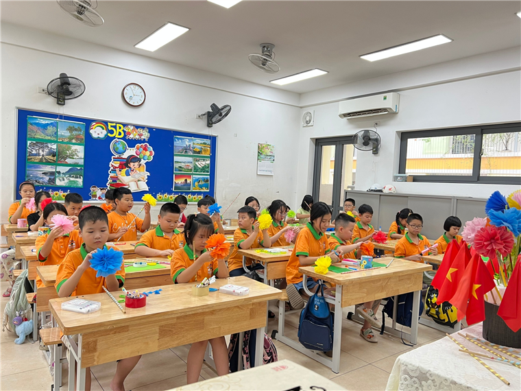 Cả lớp ríu rít tiếng cười, tiếng kéo cắt giấy sột soạt, tiếng thì thầm bàn bạc cách làm hoa đẹp nhất. Những bông hoa giấy xinh xắn không chỉ làm rực rỡ thêm không gian ngày khai giảng, mà còn chứa đựng bao tình cảm và sự háo hức của cô trò dành cho năm học mới.