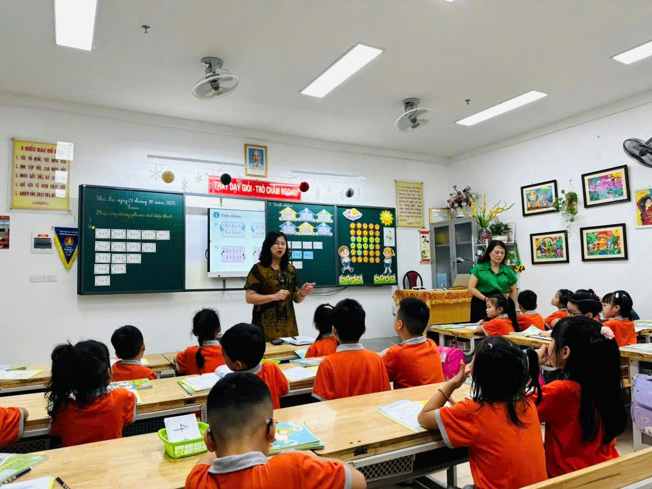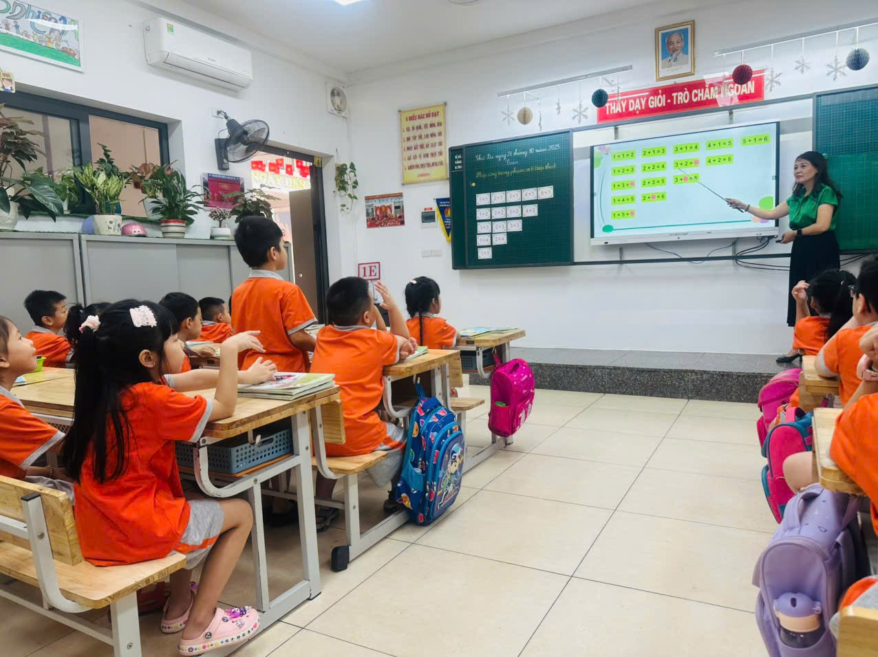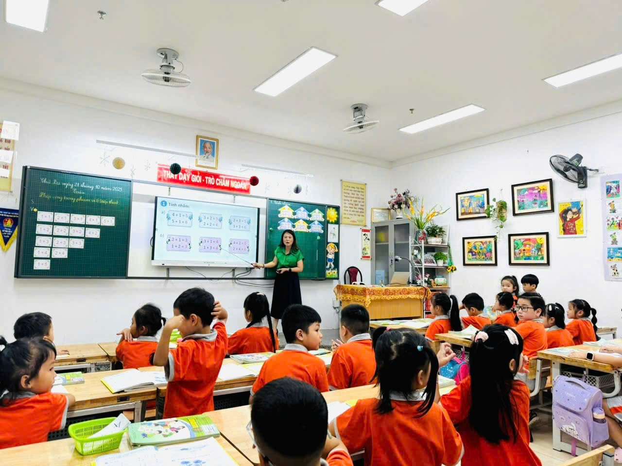 Với cách dẫn dắt tự nhiên, cô giáo Kiều Anh đã đưa các em lớp 1E đến với tiết Toán học qua các tình huống thực tế. Từ việc khám phá các phép cộng đến luyện tập qua trò chơi, cô giúp học sinh nắm vững kiến thức mà vẫn cảm nhận được niềm vui học tập. Học sinh được quan sát, thảo luận, nêu nhận xét, rồi cùng nhau tìm ra quy luật của phép cộng – một quá trình khám phá nhẹ nhàng nhưng hiệu quả.