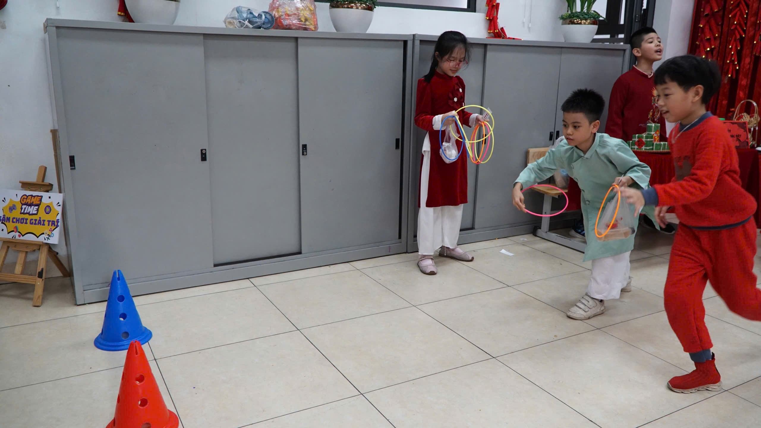 Sân chơi giải trí: Không chỉ có mua sắm, các con còn được trải nghiệm nét đẹp văn hóa qua trò chơi dân gian “Ném vòng khéo léo” và thử thách trí tuệ với góc “Giải câu đố” đầy thú vị.