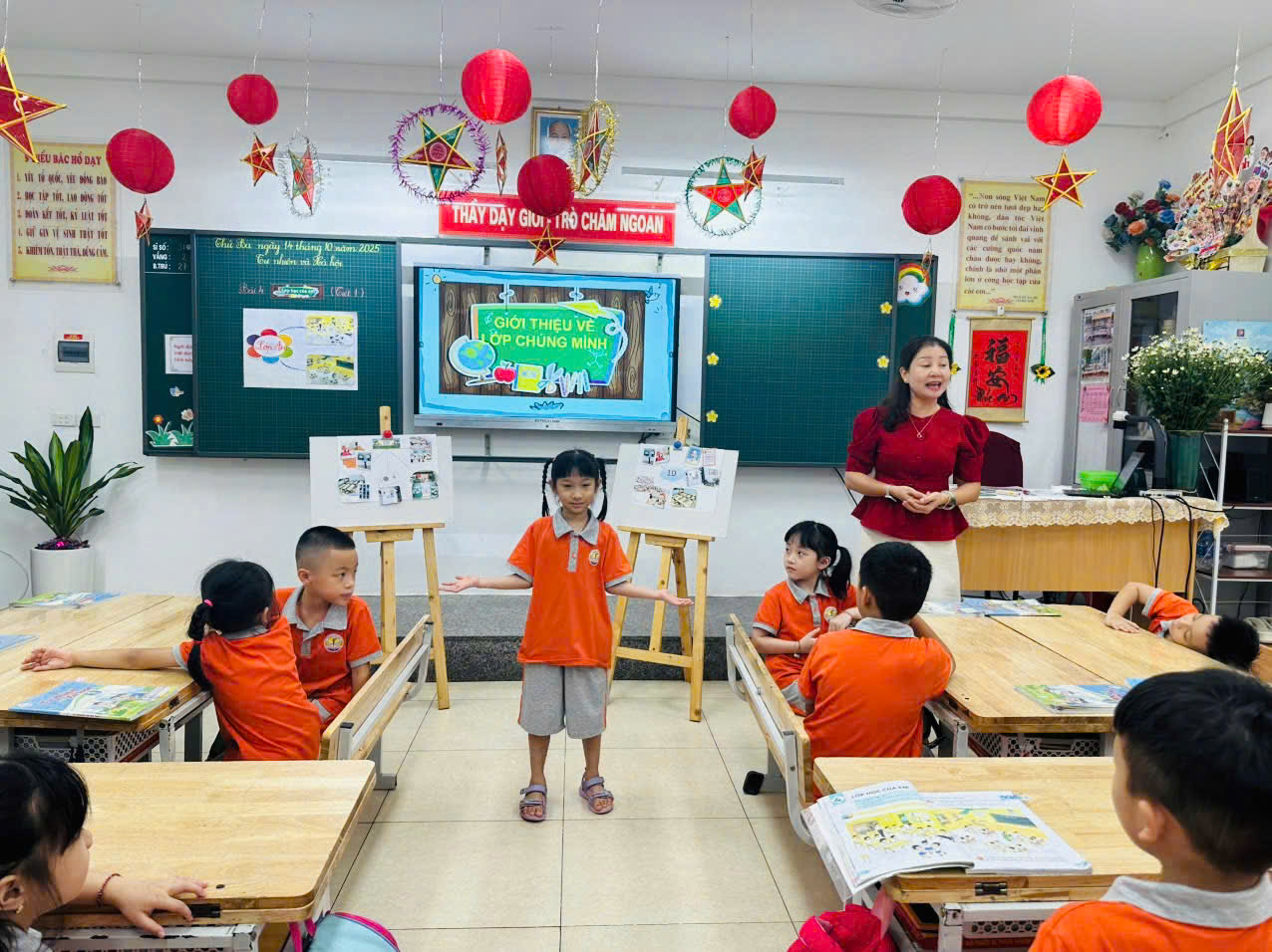 Tiết học còn trở nên sinh động hơn khi các nhóm học sinh cùng trưng bày tranh minh họa, giới thiệu lớp học của mình với giọng nói trong trẻo và tự tin. Cả lớp hào hứng vỗ tay khen ngợi nhau, tạo nên một bầu không khí học tập thật vui tươi và đoàn kết.