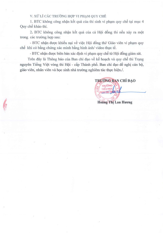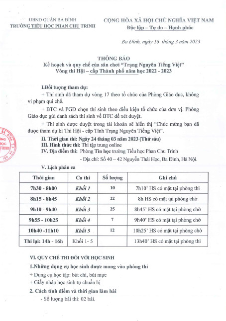 Trường Tiểu học Phan Chu Trinh thông báo kế hoạch và quy chế của sân chơi "Trạng Nguyên Tiếng Việt" vòng thi Hội - cấp Thành phố năm học 2022 - 2023