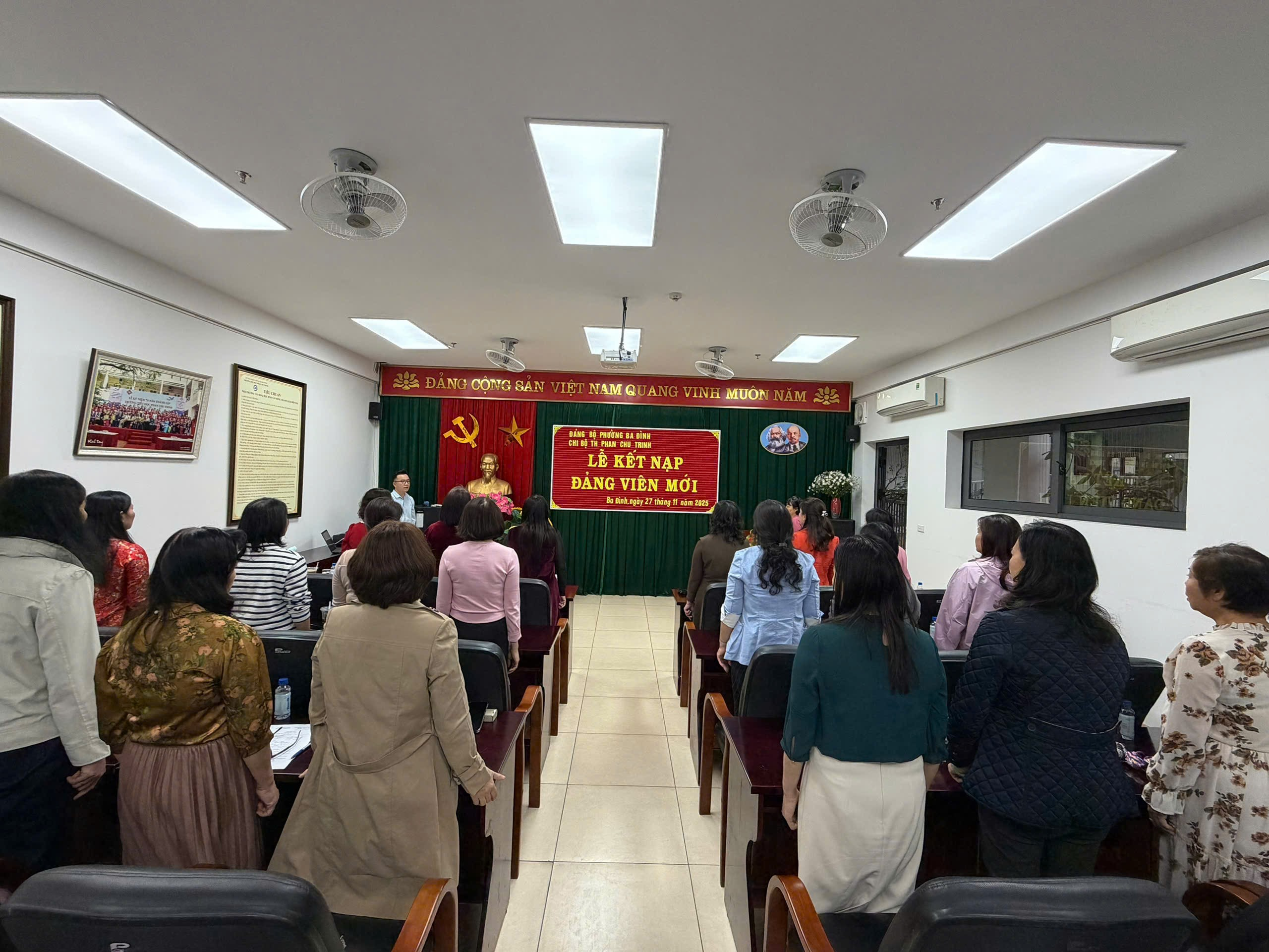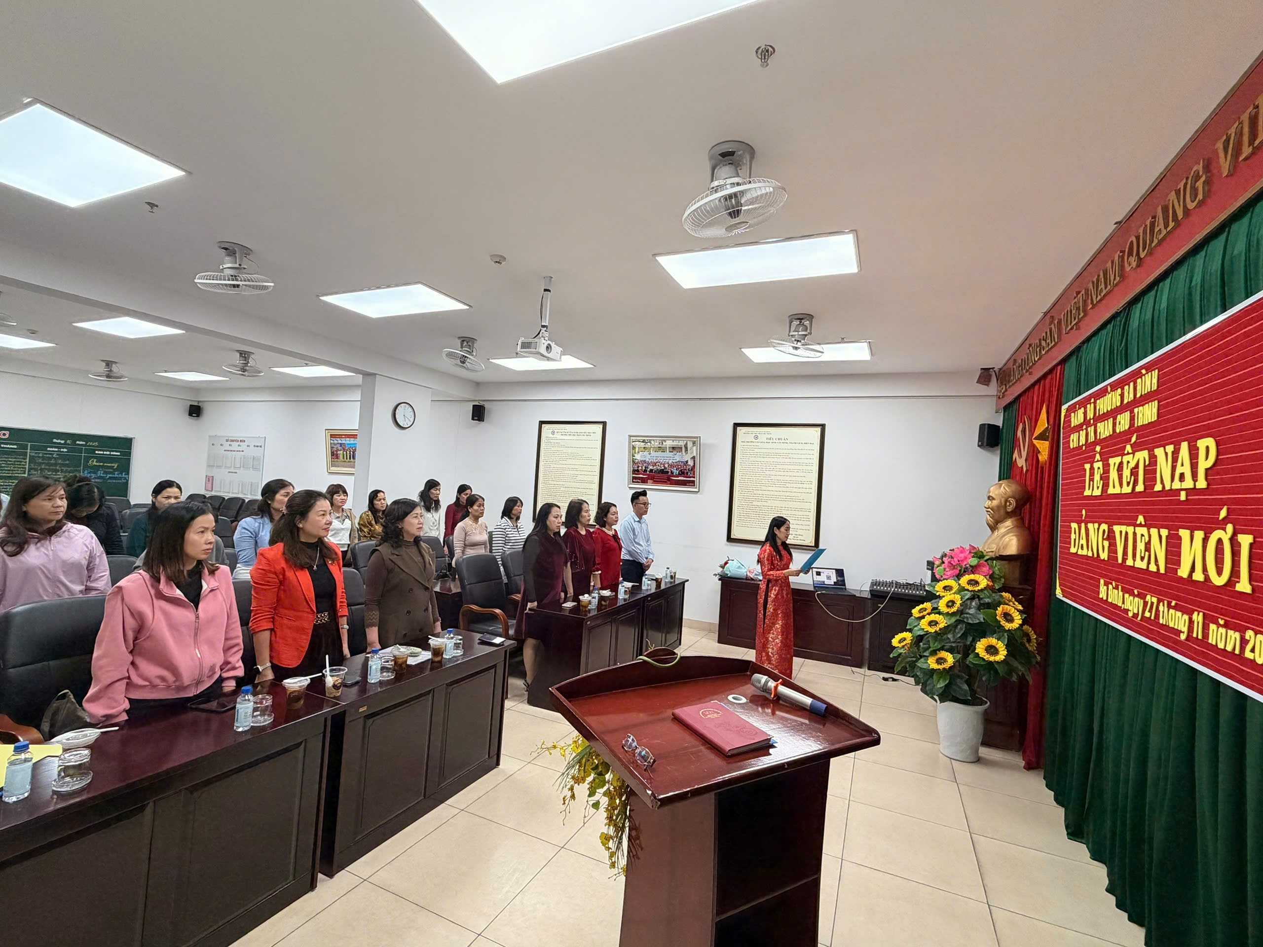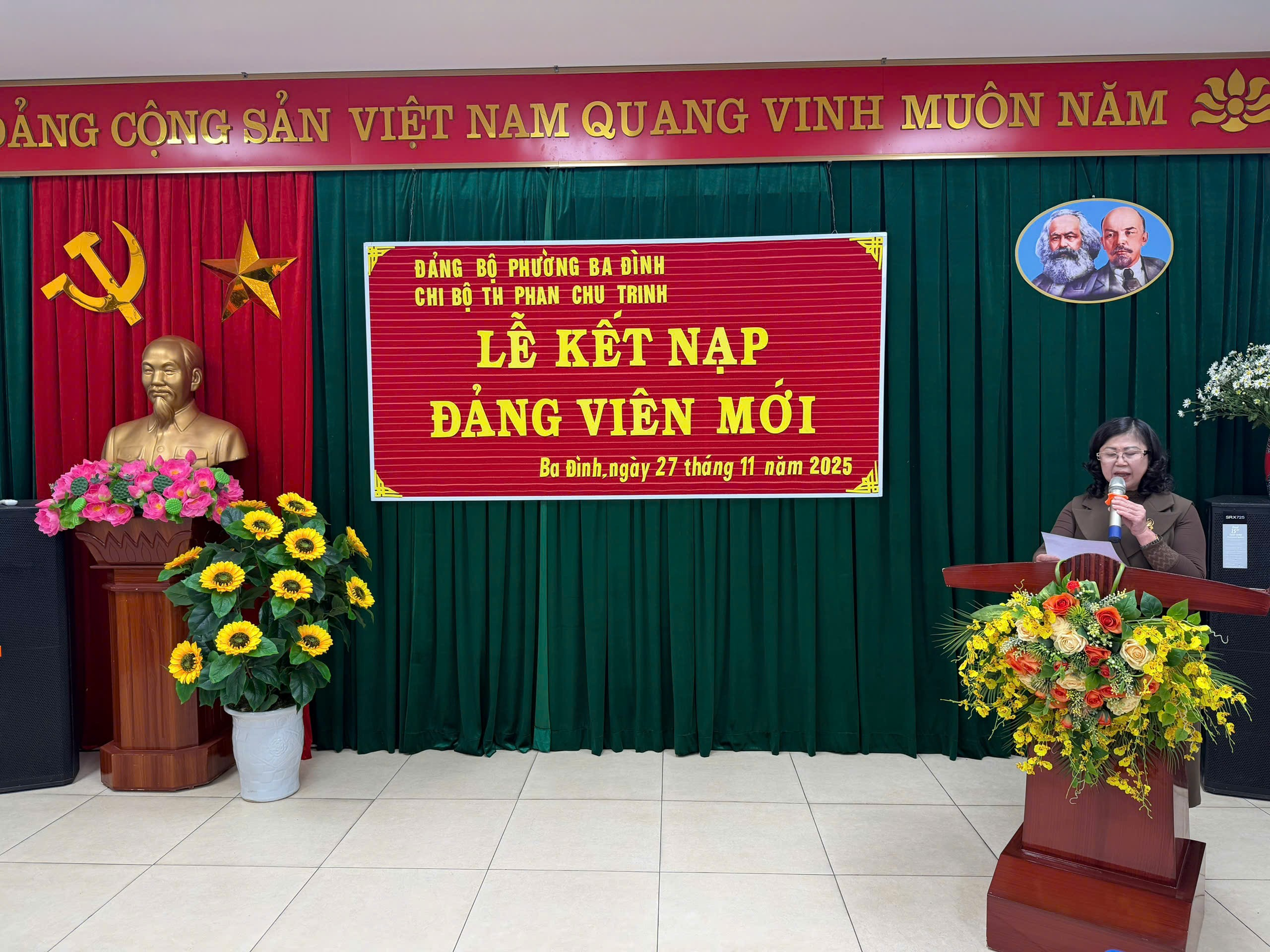 Thực hiện Nghị quyết Đại hội Chi bộ Trường tiểu học Phan Chu Trinh nhiệm kì 2025-2027 về việc phát triển đảng viên. Được sự nhất trí của Đảng uỷ Phường Ba Đình, chiều ngày ngày 27/11/2025, Chi bộ Trường tiểu học Phan Chu Trinh đã long trọng tổ chức lễ kết nạp đảng viên mới đối với quần chúng ưu tú Tạ Thị Hải Yến, giáo viên trường Tiểu học Phan Chu Trinh. Đây là sự kiện có ý nghĩa quan trọng trong công tác xây dựng Đảng, góp phần phát triển, nâng cao chất lượng và sức chiến đấu của Chi bộ nhà trường.