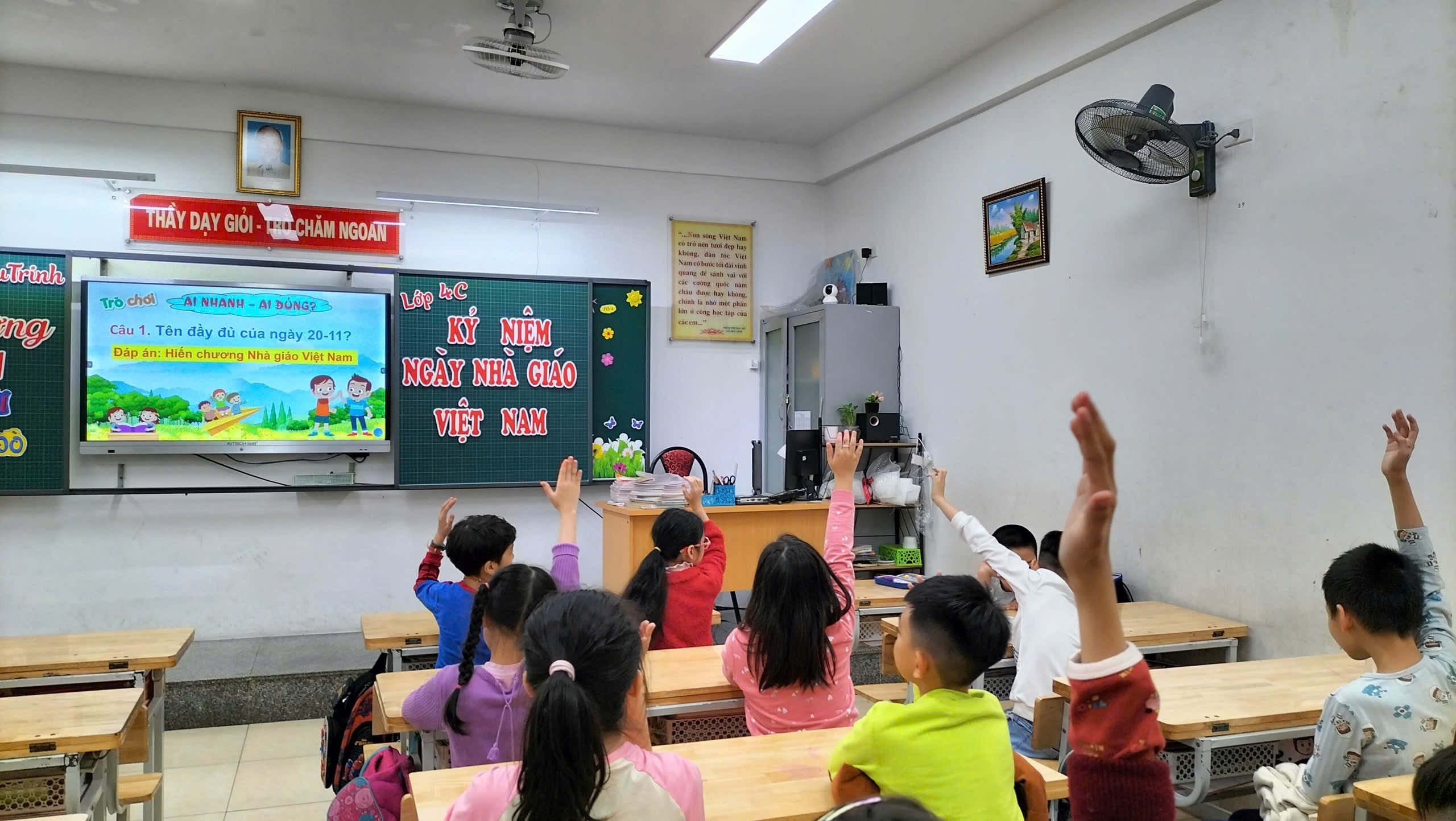 Cuối buổi, không khí trở nên sôi động với trò chơi “Ai nhanh – Ai đúng?”. Những câu hỏi liên quan đến lịch sử ngày 20/11, các tấm gương nhà giáo Việt Nam,… đã giúp các em vừa vui chơi, vừa ghi nhớ thêm nhiều kiến thức bổ ích. Trò chơi đem lại tiếng cười, sự hào hứng, đồng thời giúp các em thể hiện tinh thần đoàn kết, tôn trọng tri thức, gửi tới thầy cô sự tri ân bằng cả tấm lòng.