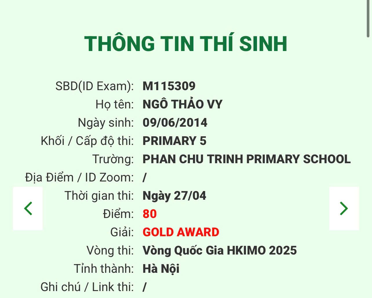 🥇 Huy chương Vàng vòng Quốc gia cuộc thi Toán Quốc tế HKIMO (HongKong International Mathematical Olympiad)