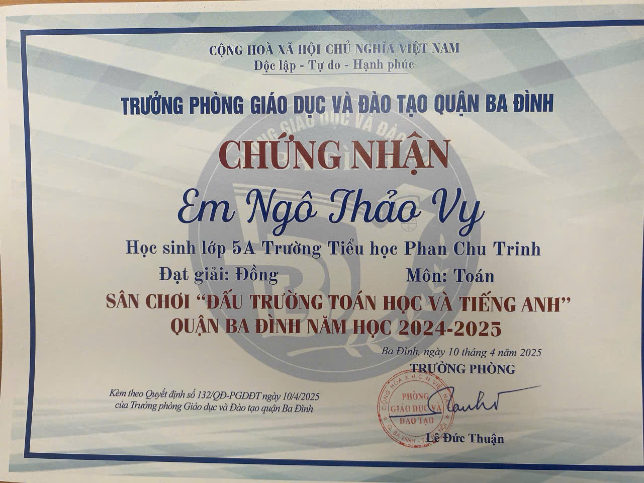 🥉 Huy chương Đồng cấp Quận cuộc thi "Đấu trường Toán và Tiếng Anh"