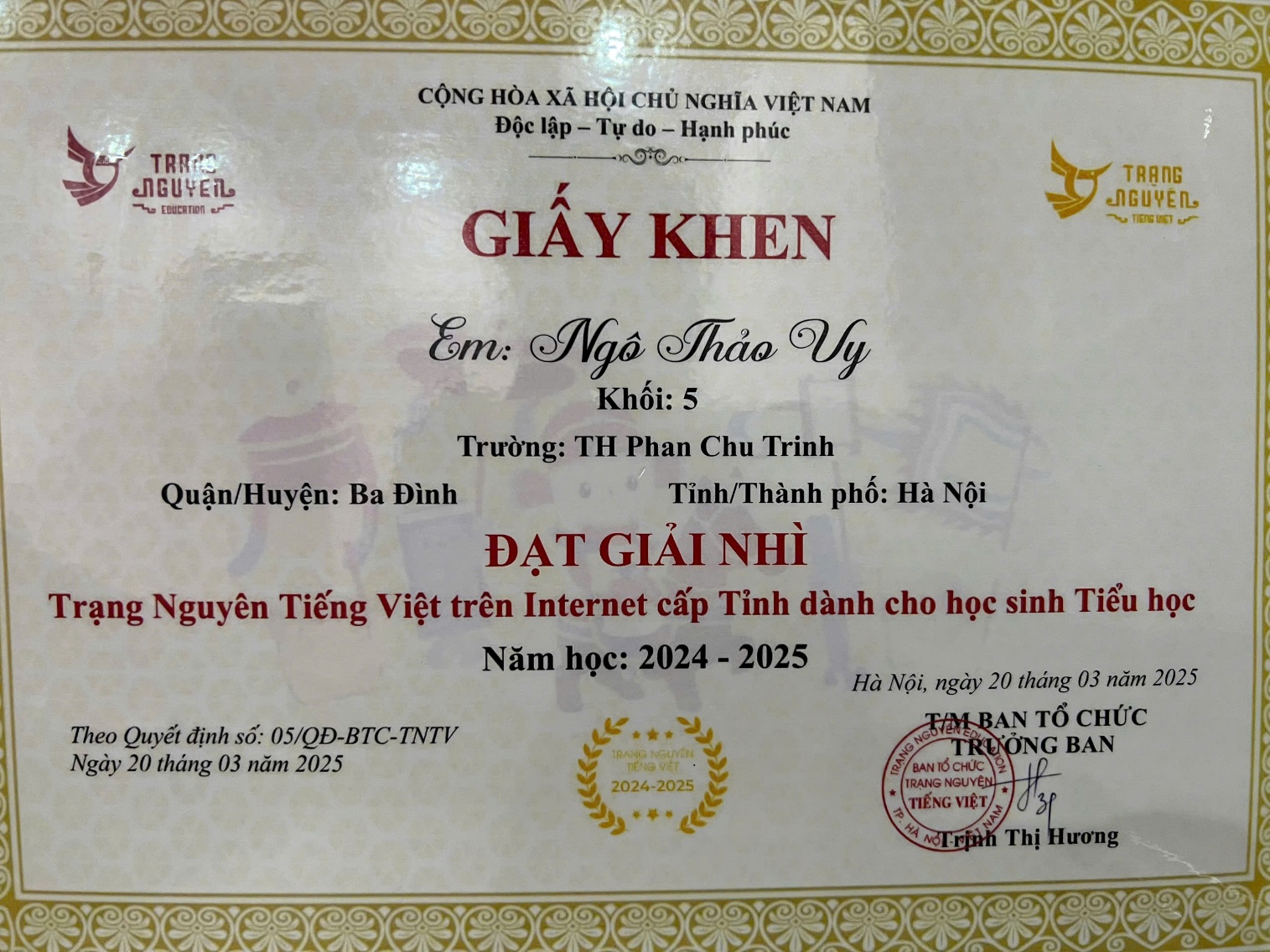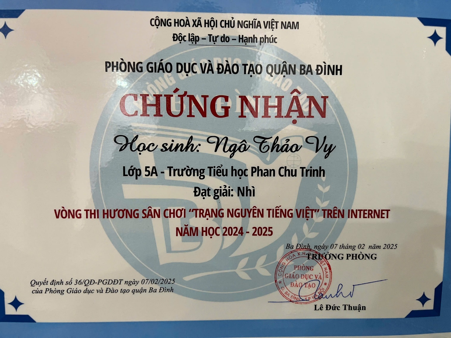 * Giải Nhì cấp Quận cuộc thi Trạng Nguyên Tiếng Việt trên Internet