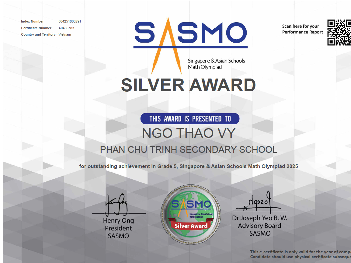 🥈 Huy chương Bạc cuộc thi Toán Quốc tế SASMO (Singapore and Asian Schools Math Olympiad)