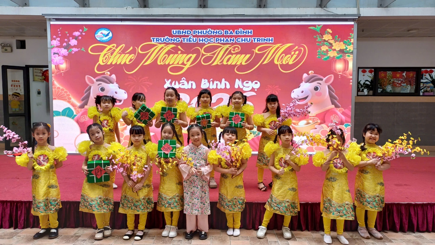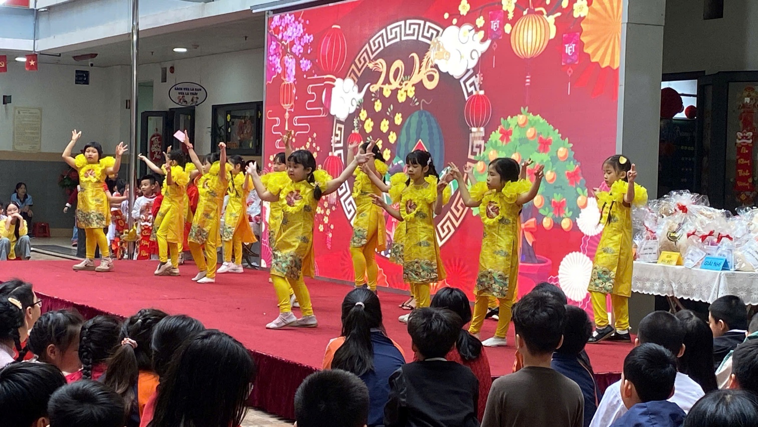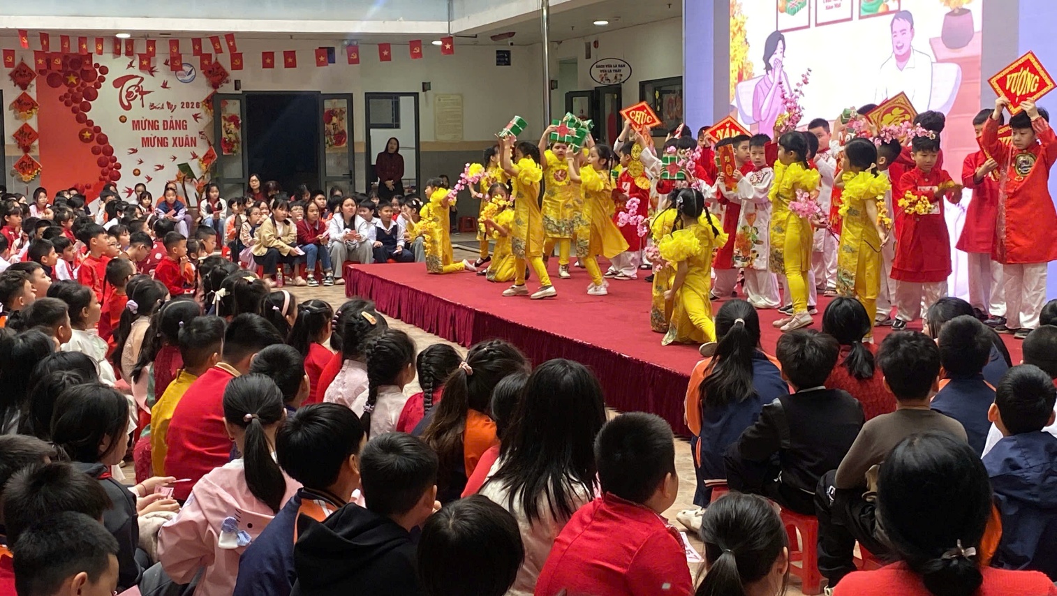 Ngay từ sớm, không khí sân trường đã trở nên tươi mới hơn bởi sắc màu rạng rỡ của những bộ trang phục và những nụ cười hồn nhiên. Trong tiếng nhạc vui tươi của bài hát “Tết bao vui”, các em học sinh lớp 2A tự tin bước ra sân khấu nhỏ giữa sân trường. Những động tác múa nhịp nhàng, những cánh tay vươn cao theo từng giai điệu, những bước chân hồn nhiên hòa cùng tiếng hát trong trẻo đã làm bừng sáng cả không gian. Tiếng vỗ tay vang lên không ngớt, hòa cùng tiếng cười giòn tan tạo nên một bản hòa ca mùa xuân đầy sức sống.