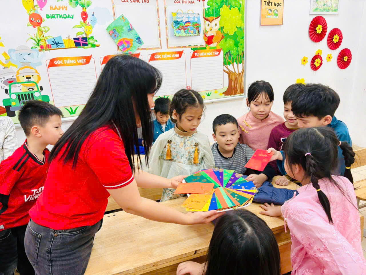 Sau những phút giây sôi động ngoài sân trường, cô và trò lớp 2A trở về lớp học thân thuộc – nơi không khí ấm áp tiếp tục lan tỏa. Căn phòng nhỏ dường như cũng rộn ràng hơn bởi tiếng nói cười ríu rít. Trong giây phút đầy mong chờ, cô giáo ân cần trao tận tay từng em những phong bao lì xì đỏ thắm. Những phong bao nhỏ bé nhưng chứa đựng biết bao yêu thương, là lời chúc may mắn, là niềm tin và sự gửi gắm của cô dành cho từng học trò.