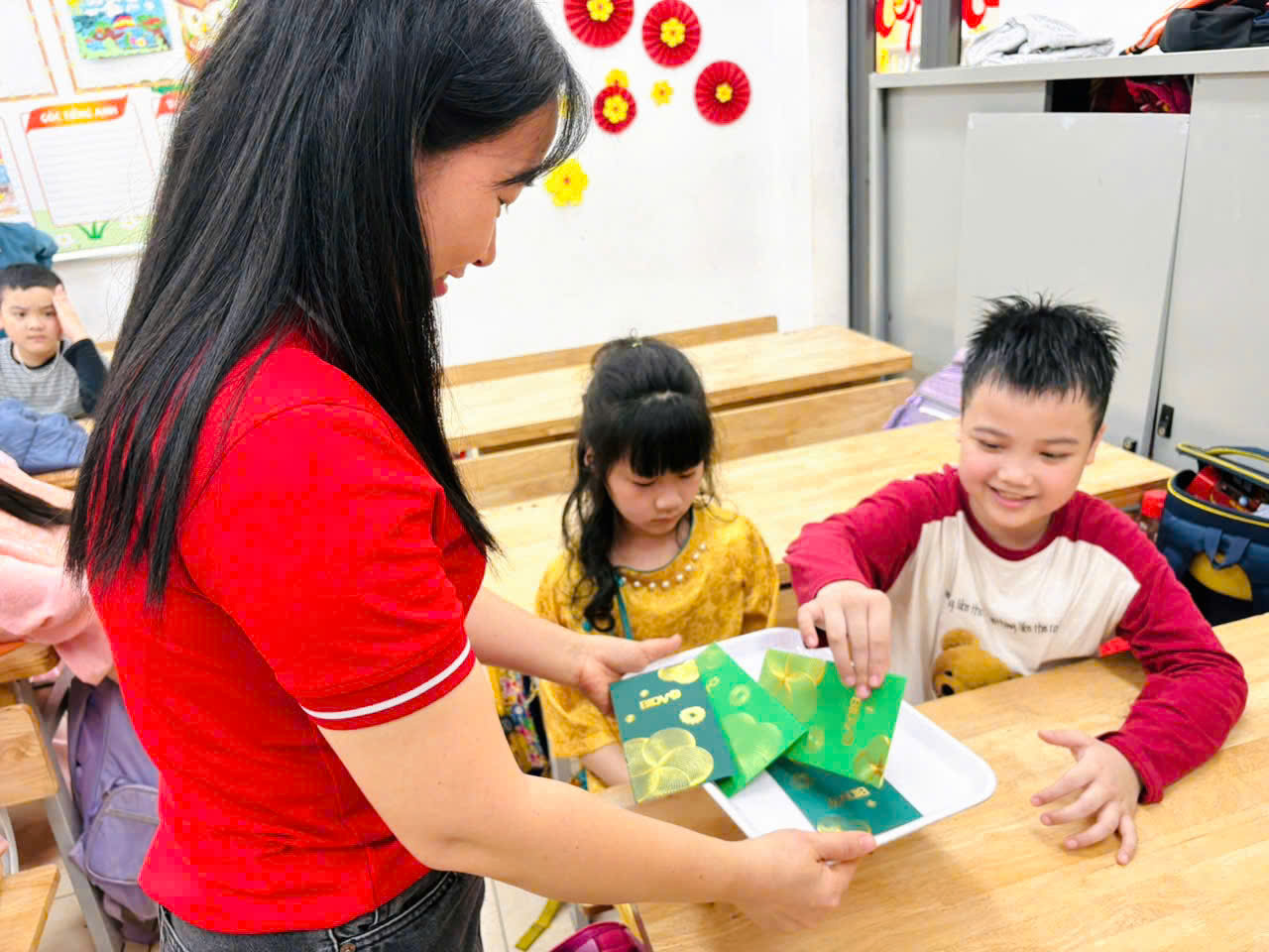 Ánh mắt các em ánh lên niềm hạnh phúc khi đón nhận bao lì xì đầu năm. Có em khẽ mỉm cười, có em nâng niu phong bao bằng cả hai tay như giữ gìn một điều may mắn cho suốt cả năm học. Trong giây phút ấy, sự gắn kết giữa cô và trò càng trở nên ấm áp, gần gũi hơn bao giờ hết. Đó không chỉ là món quà đầu xuân mà còn là sự động viên, tiếp thêm động lực để các em bước vào chặng đường học tập mới với tinh thần hứng khởi và quyết tâm.