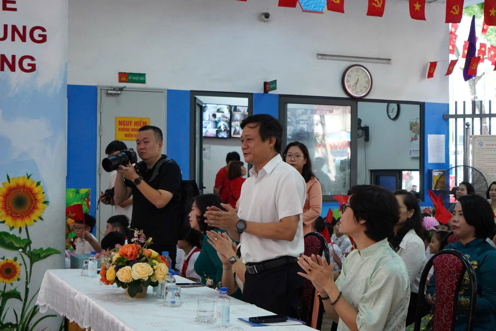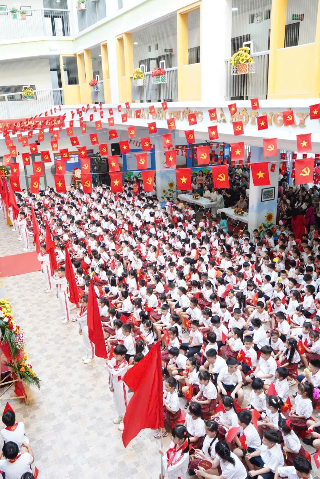 Ngay từ sáng sớm, sân trường đã rực rỡ cờ hoa, ngập tràn tiếng cười nói trong trẻo của học sinh. Những đôi mắt sáng ngời háo hức của các em lớp Một, những gương mặt rạng rỡ của các anh chị học sinh lớp trên, tất cả như hòa quyện thành một bản nhạc trong trẻo, hồn nhiên, tràn đầy sức sống tuổi thơ.