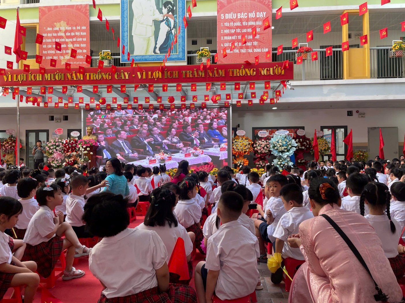 Thầy trò trường Tiểu học Phan Chu Trinh cùng hướng về Trung tâm Hội nghị Quốc gia tiếp sóng Lễ khai giảng đặc biệt. Trong khoảnh khắc ấy, hàng triệu thầy cô, học sinh trên khắp mọi miền đất nước hồi hộp mong chờ, cùng cất cao tiếng hát, cùng lắng nghe tiếng trống khai trường vang vọng từ trái tim Thủ đô. Đó là âm vang kết nối muôn triệu học sinh, sinh viên, gợi nhắc niềm tự hào, niềm tin, khát vọng vươn lên của dân tộc. Ý nghĩa của lễ khai giảng càng thêm sâu sắc khi 52.000 cơ sở giáo dục trên cả nước cùng kết nối trực tuyến kết hợp truyền hình trực tiếp, với sự hiện diện của các đồng chí lãnh đạo cao nhất của Đảng và Nhà nước, để lan tỏa niềm tin, khí thế, và quyết tâm đưa nền giáo dục Việt Nam vươn tới những tầm cao mới.