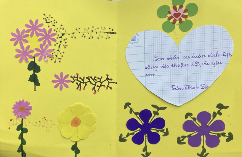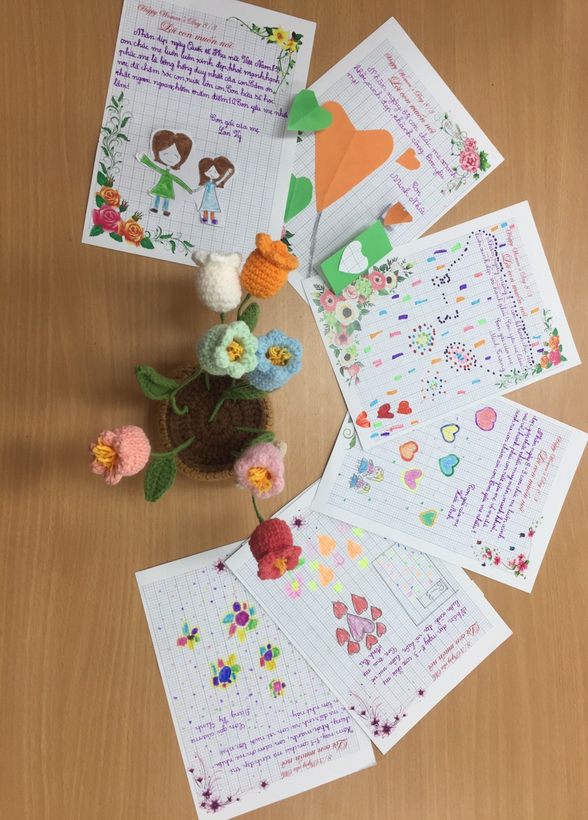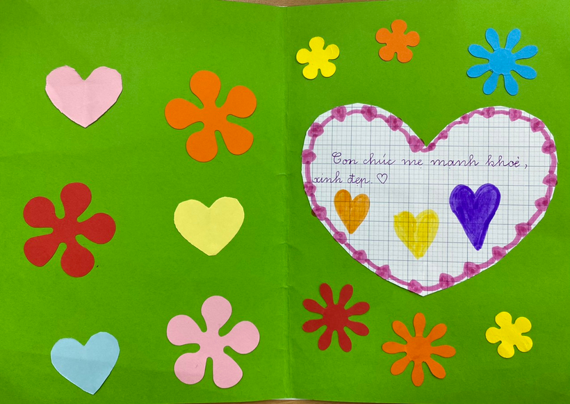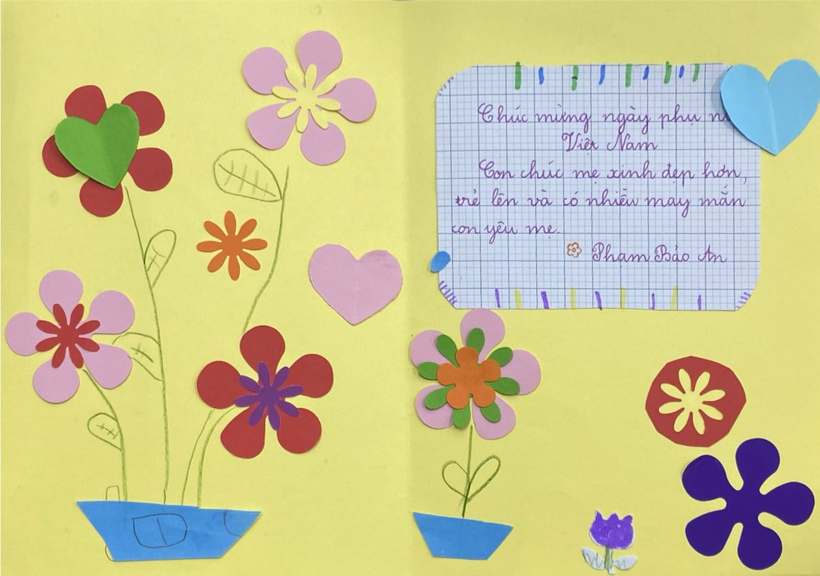 Một trong những hoạt động được các bạn sôi nổi hưởng ứng, nhiệt tình tham gia là hoạt động làm thiệp chúc mừng. Để có được những tấm thiệp xinh xắn, đầy màu sắc, ngộ nghĩnh và dễ thương, các bạn đã miệt mài sáng tạo, chăm chỉ, khéo léo tạo hình từ những tờ giấy màu, những cây bút dạ, chì màu,… Mỗi bông hoa, mỗi trái tim trên tấm thiệp gửi gắm vào đó biết bao tình cảm, lòng biết ơn của các bạn đối với những người phụ nữ quan trọng và đáng kính của mình. Những lời chúc, lời nhắn nhủ tâm tình ngây thơ non nớt mà thật đáng yêu.