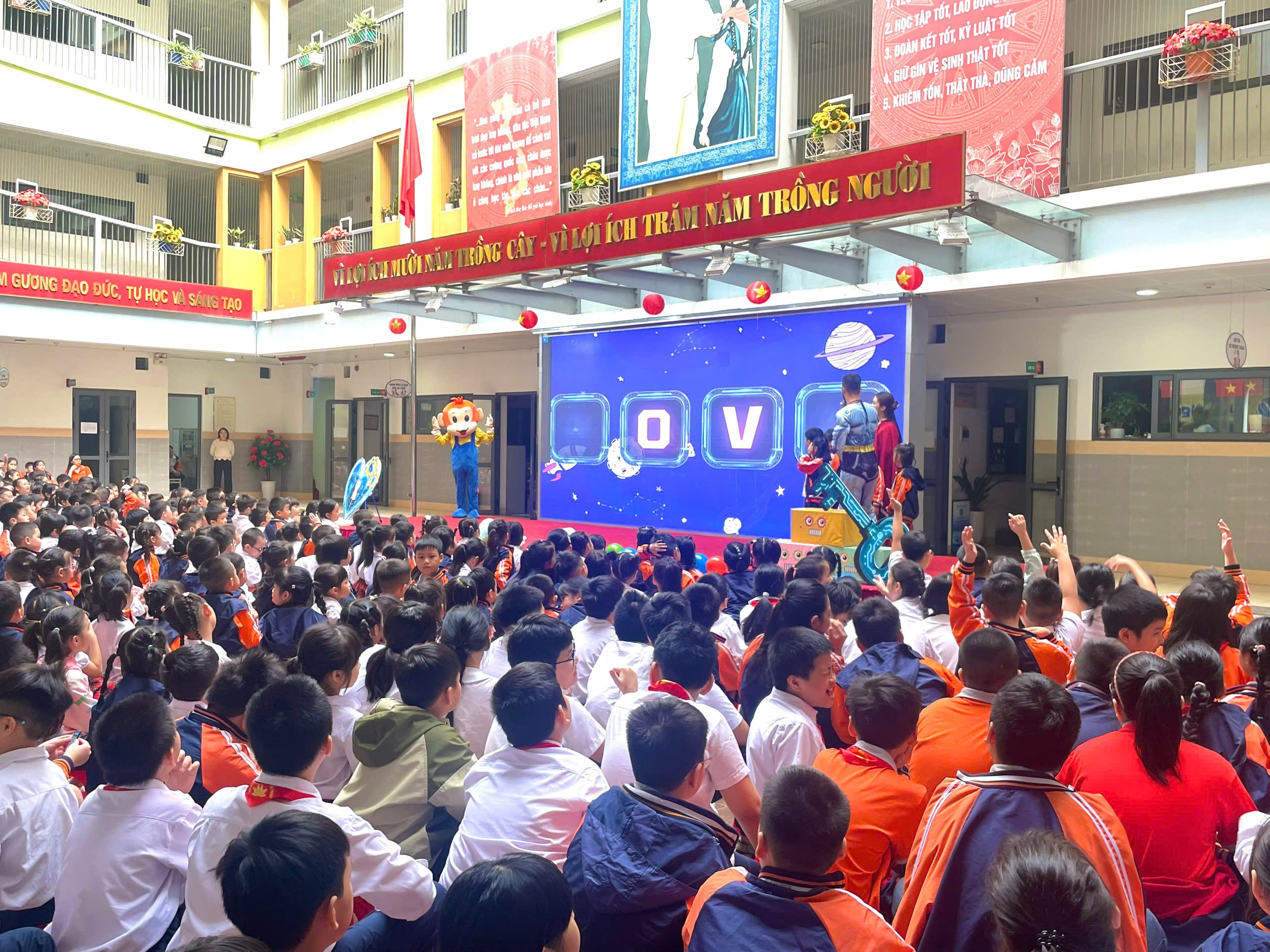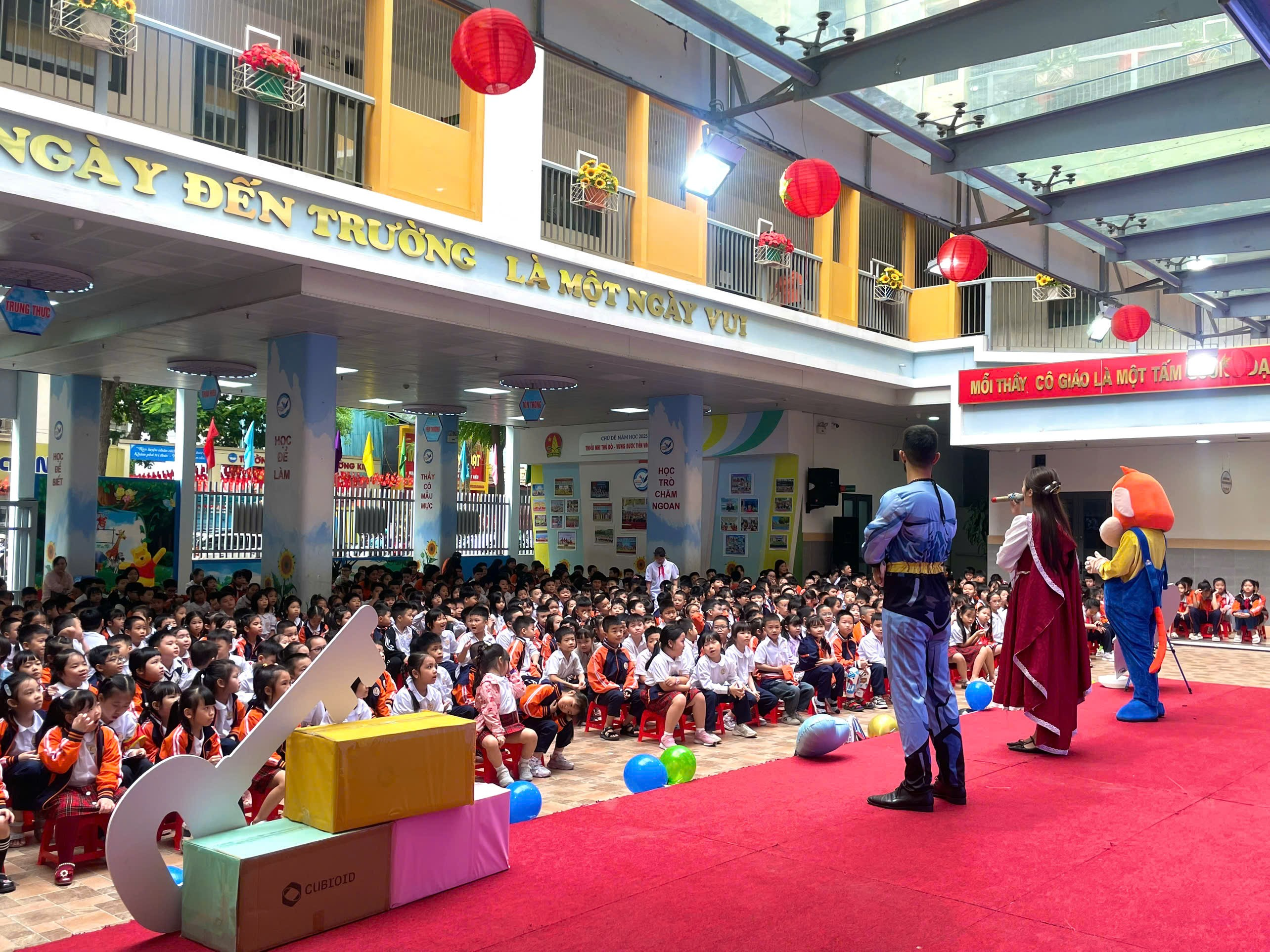 Trong không gian rộn ràng và tươi vui, các bạn học sinh sẽ cùng Mascot Robot khám phá thế giới công nghệ qua các trò chơi tương tác, thử thách tiếng Anh, vũ điệu sôi động và những màn đố vui hấp dẫn, trả lời câu hỏi tư duy, tham gia các trò chơi kỹ năng, phối hợp sự đoàn kết giữa các đội.