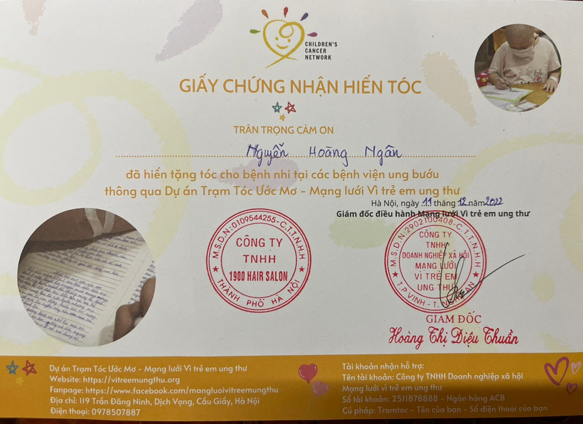 Ngày 11/12/2022, Hoàng Ngân đã gửi tặng bệnh nhi ung thư mái tóc của mình.