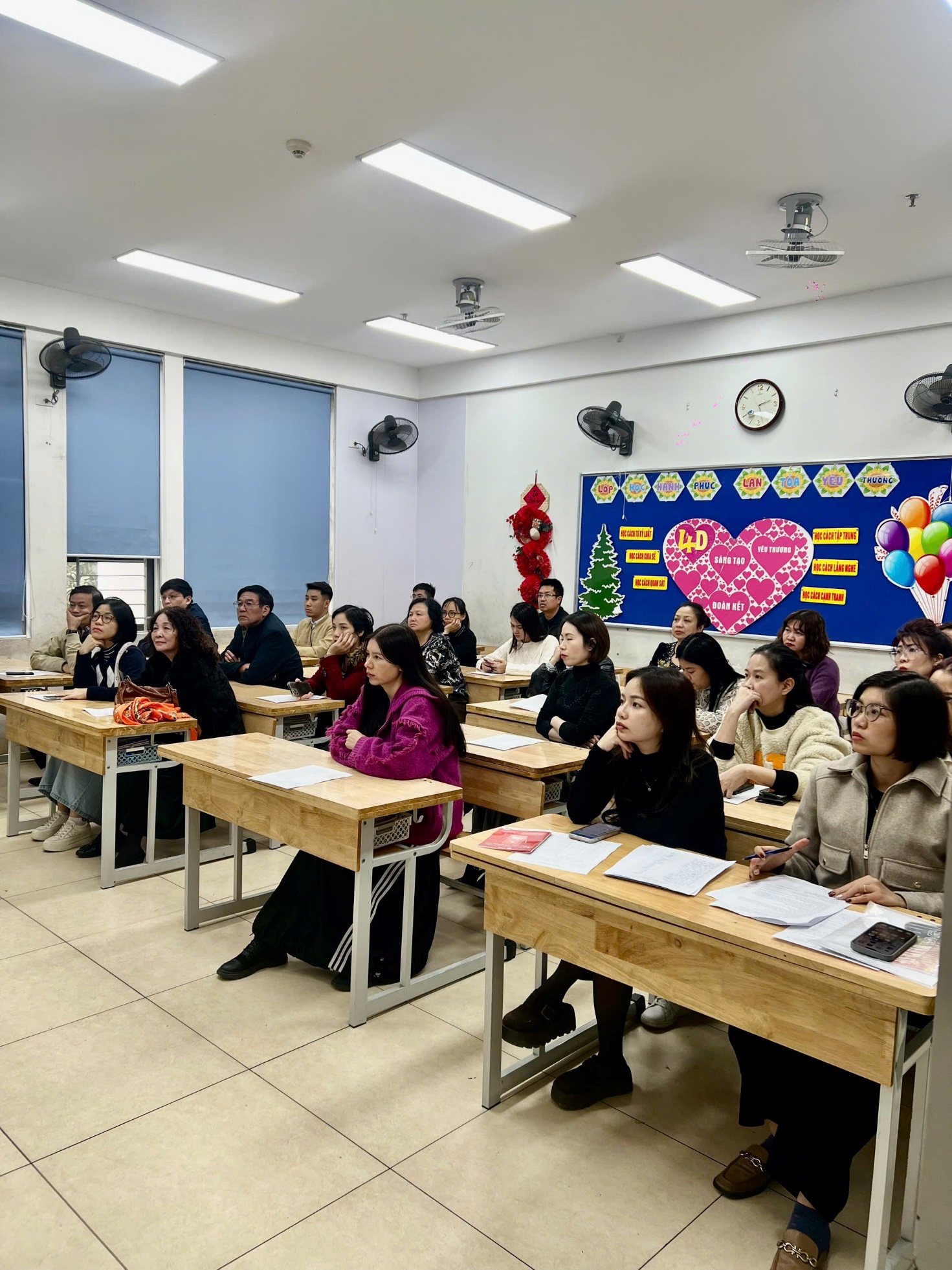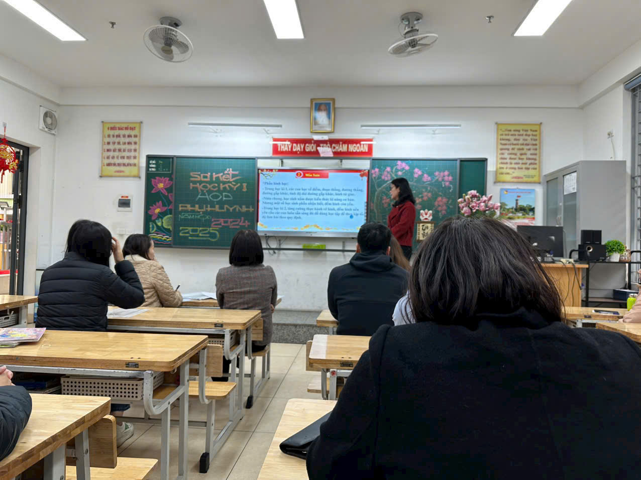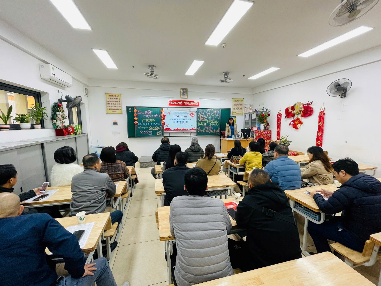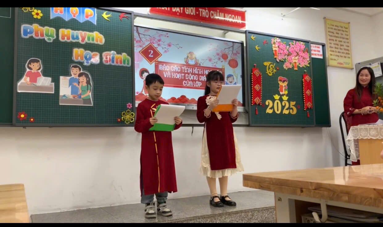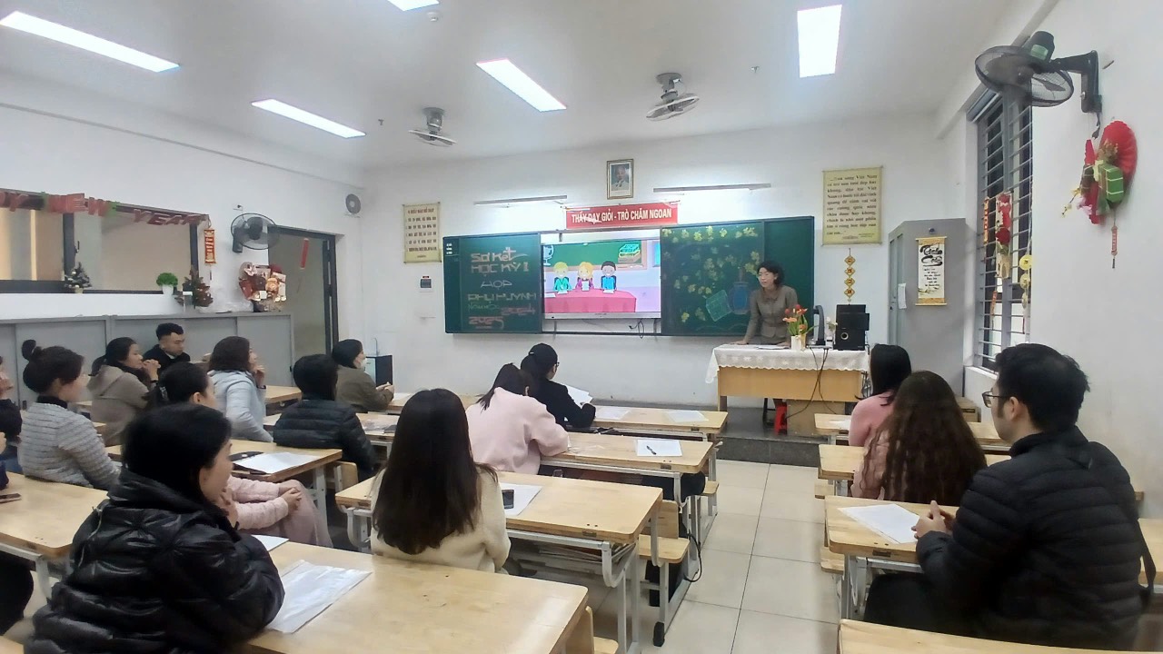 Trong buổi họp, thầy cô giáo không chỉ truyền đạt thông tin mà còn chia sẻ những câu chuyện nhỏ về sự cố gắng, tiến bộ của từng học sinh, khiến không khí trở nên nhẹ nhàng, đầy cảm xúc. Những lời trò chuyện chân thành, cởi mở, cùng nụ cười thân thiện của thầy cô đã xóa đi khoảng cách, làm phụ huynh cảm nhận được các thầy cô trân trọng, quan tâm đến từng cá nhân học sinh. Xen kẽ giữa các nội dung là những khoảnh khắc thú vị khi phụ huynh cùng xem lại những đoạn video ngắn ghi lại hoạt động học tập của các con, hoặc lắng nghe những lời chúc Tết đáng yêu từ chính các em qua các tấm thiệp tự tay làm. Sự tận tâm, gần gũi của thầy cô đã biến buổi họp không chỉ là một cuộc trao đổi thông tin mà còn là một dịp để kết nối và chia sẻ, giúp gia đình và nhà trường thêm phần gắn bó, đồng hành vì sự phát triển của các em học sinh.