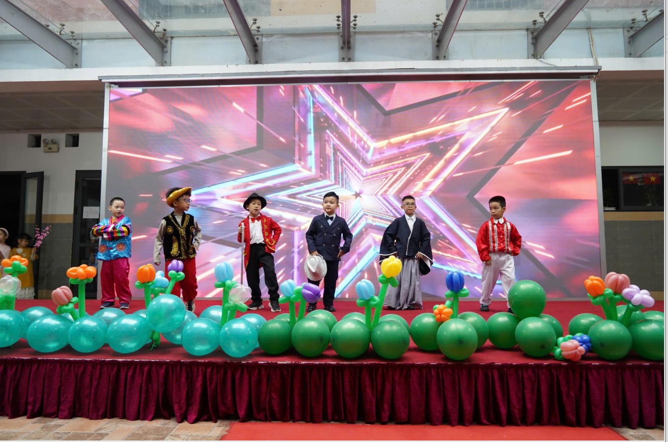 Các em học sinh lớp 1C, tuy còn nhỏ tuổi nhưng đã tự tin sải bước trên sân khấu, giới thiệu những bộ trang phục truyền thống đặc trưng của nhiều quốc gia trên thế giới. Từ tà áo dài duyên dáng của Việt Nam, trang phục kimono thanh lịch của Nhật Bản, váy flamenco rực rỡ của Tây Ban Nha đến những bộ trang phục châu Phi đầy màu sắc, mỗi phần trình diễn đều mang đến một sắc thái văn hóa riêng, sinh động và hấp dẫn.