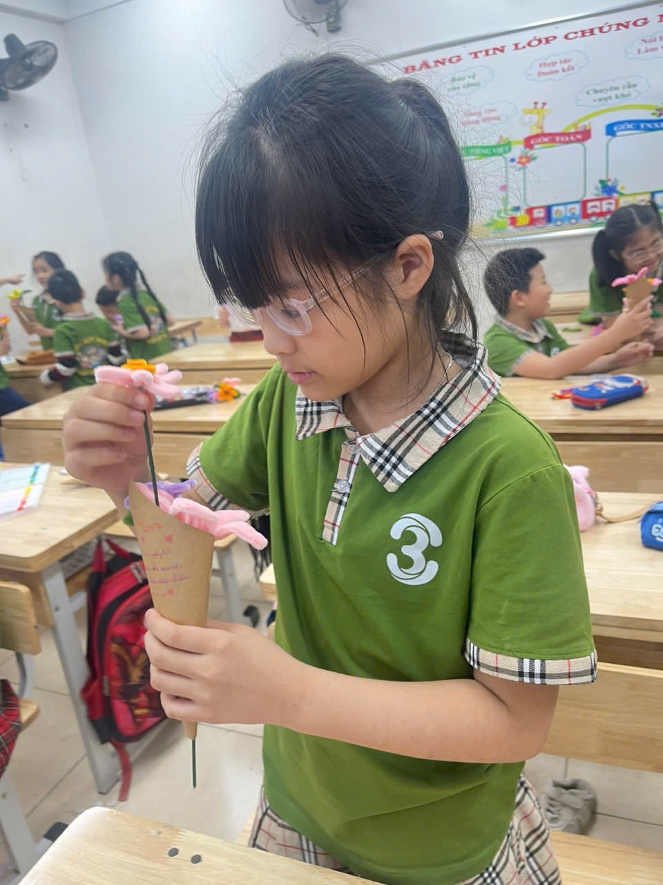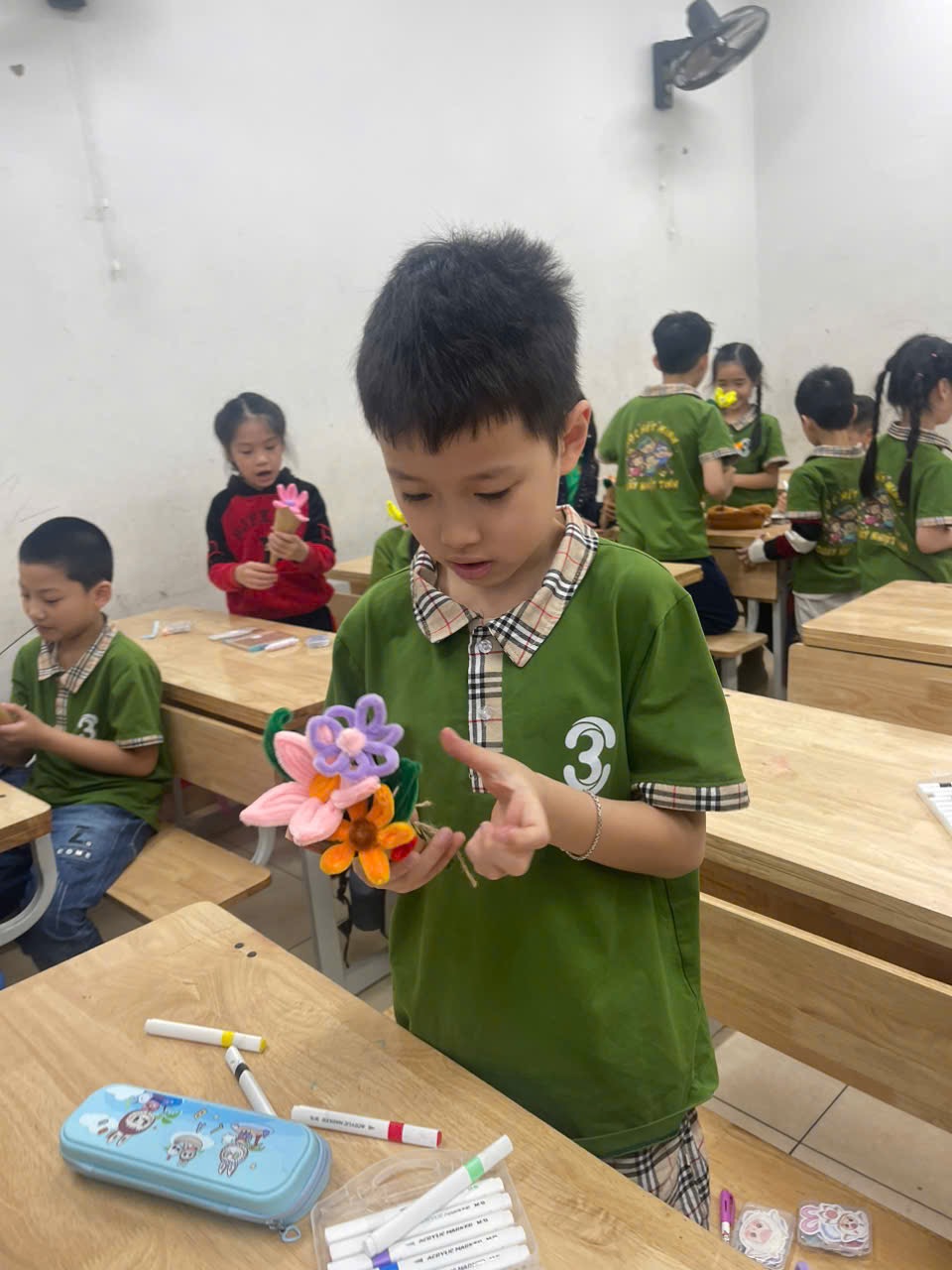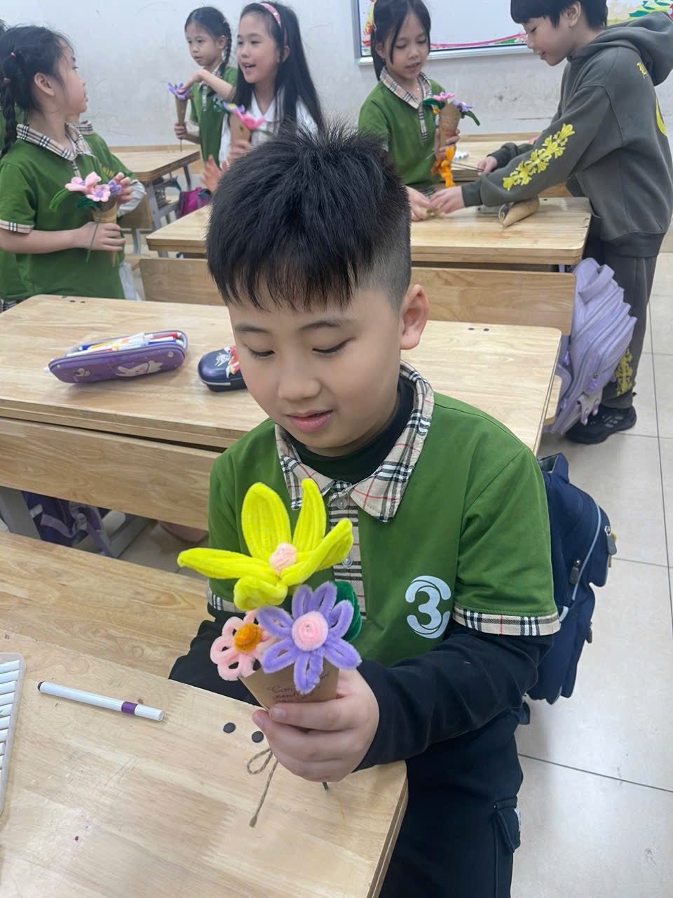 Bên cạnh đó, các em còn tham gia hoạt động cắm hoa và viết những lời chúc dành tặng những người phụ nữ thân yêu. Mỗi bông hoa, mỗi dòng chữ tuy giản dị nhưng chứa đựng biết bao tình cảm và sự trân trọng mà các em muốn gửi gắm. Đây không chỉ là một buổi sinh hoạt mà còn là dịp để các em bày tỏ lòng biết ơn đối với mẹ, cô giáo và những người phụ nữ yêu quý của mình. Những nụ cười rạng rỡ, những lời chúc chân thành chính là minh chứng cho một ngày 8/3 tràn đầy yêu thương.