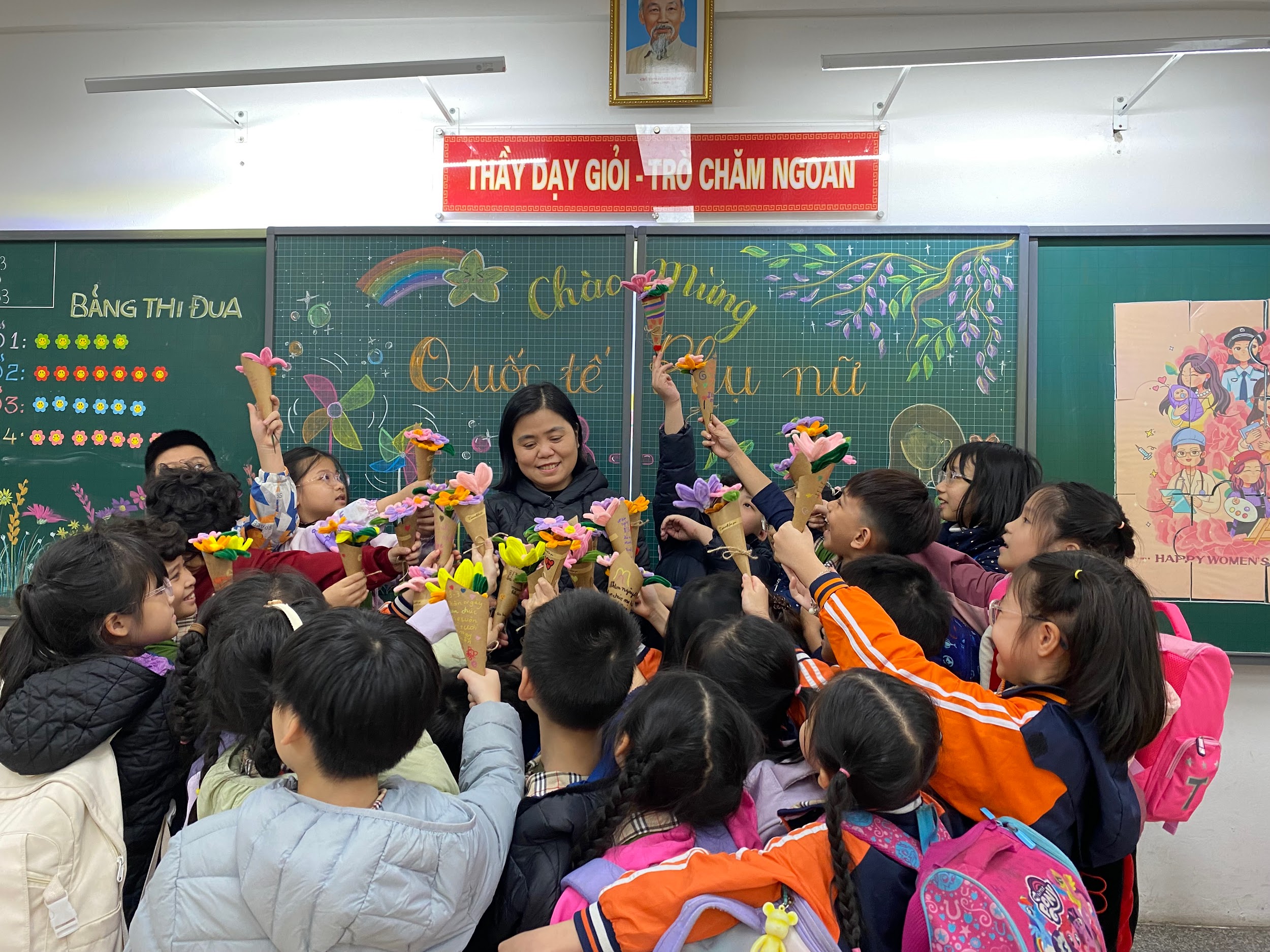 Hình ảnh các em học sinh vui vẻ bên những bó hoa và lời chúc tặng mẹ, cô