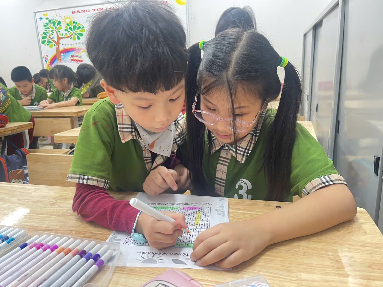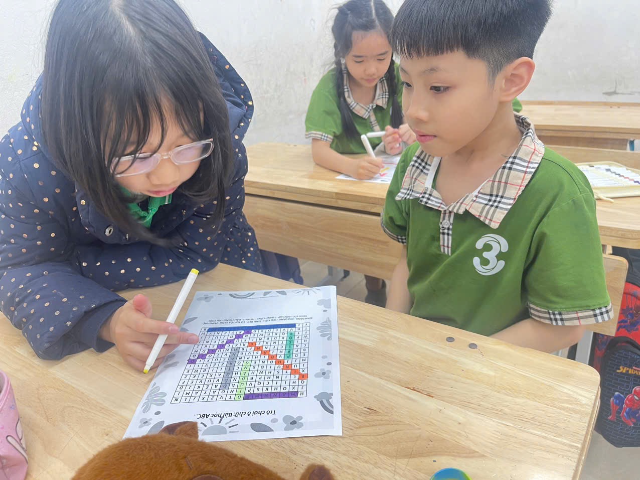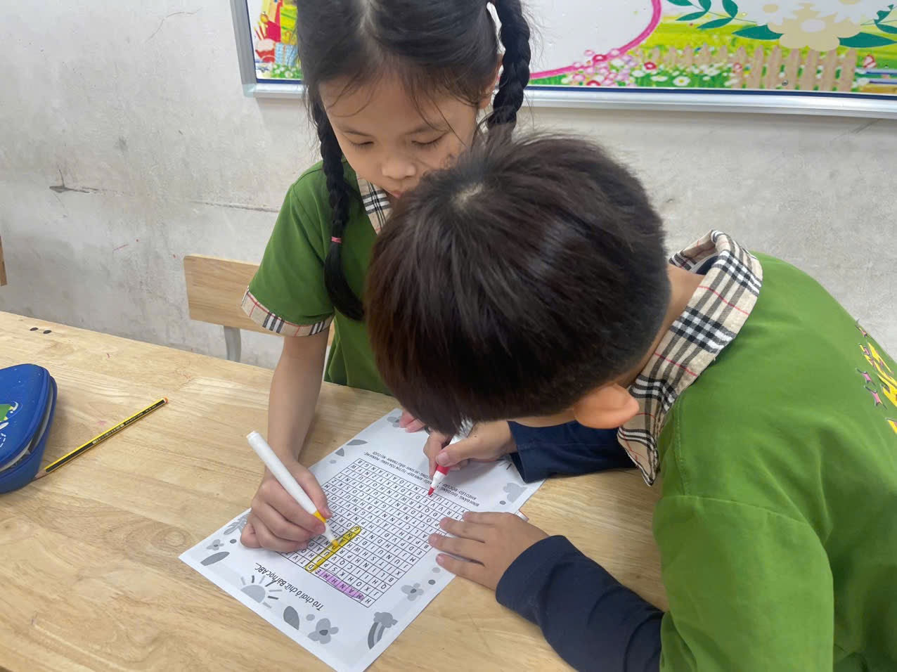 Không chỉ vậy, các em học sinh lớp 3C còn tham gia hoạt động ghép chữ để khám phá những phẩm chất cao đẹp của người phụ nữ. Mỗi nhóm được phát tờ giấy chứa những chữ cái rời rạc, nhiệm vụ của các em là cùng nhau tìm kiếm, ghép nối để tạo thành những từ khóa ý nghĩa. Trong không khí sôi nổi, hào hứng, từng từ dần hiện ra: “Nhân hậu”, “Chăm chỉ”, “Dũng cảm”, “Tận tụy”, “Yêu thương”, “Kiên cường”…Qua hoạt động này, không chỉ khả năng tư duy và làm việc nhóm của các em được rèn luyện mà quan trọng hơn, các em hiểu sâu sắc hơn về những đức tính quý giá của người phụ nữ, từ đó biết trân trọng, yêu thương và học tập theo những tấm gương ấy.