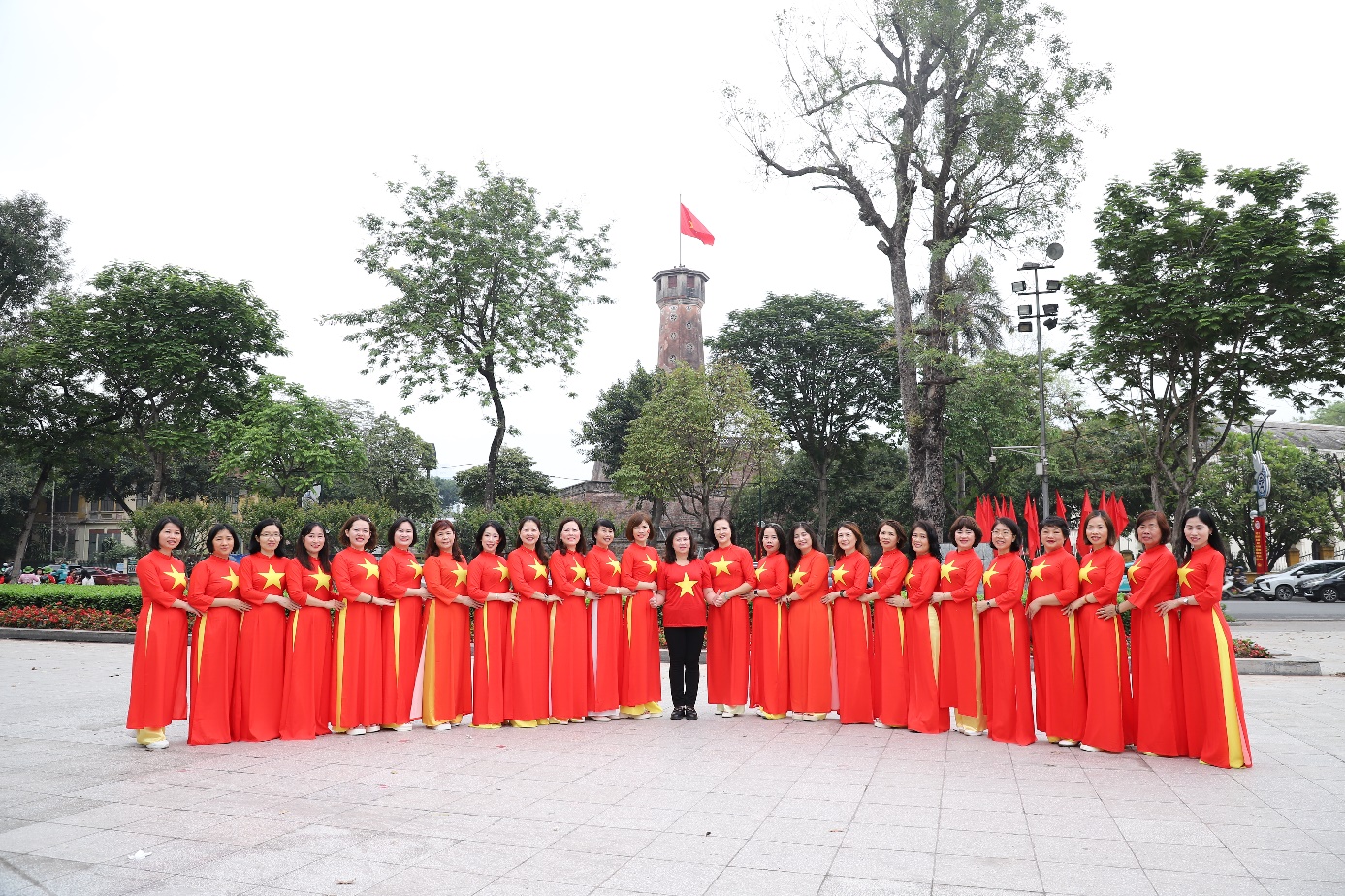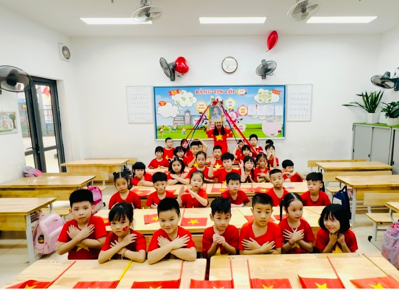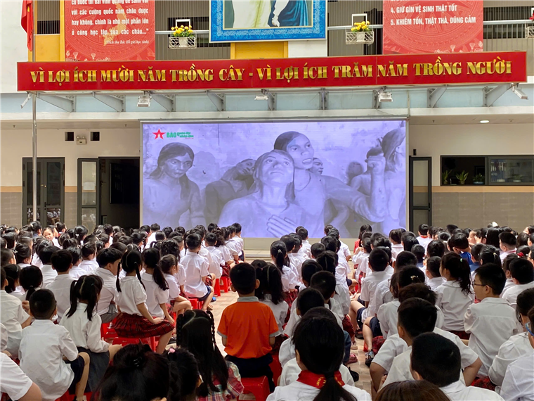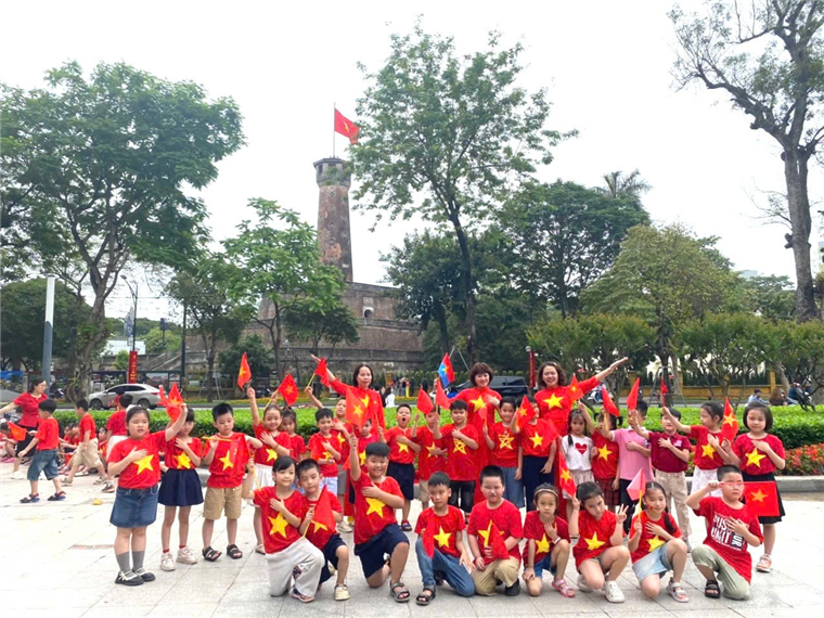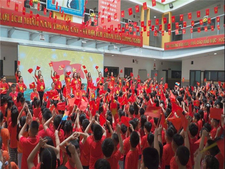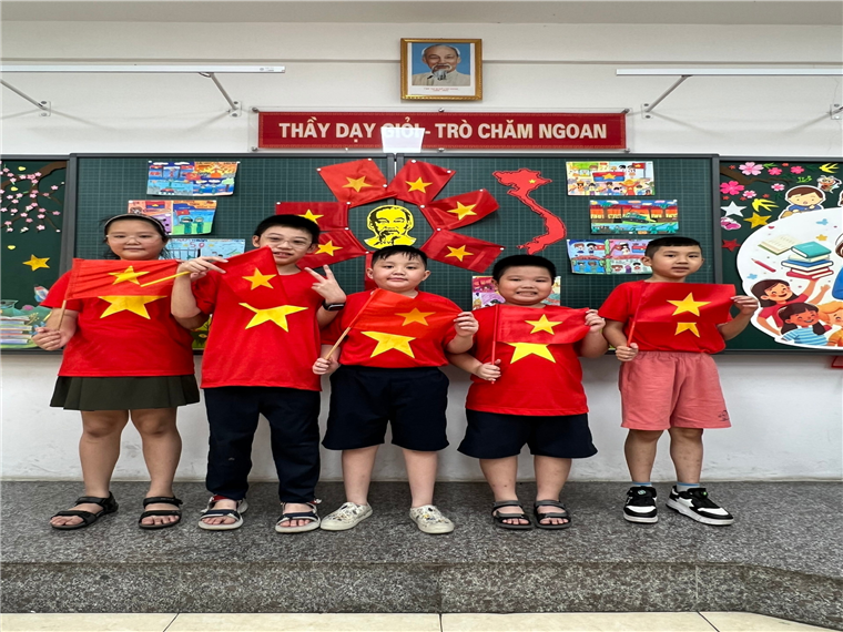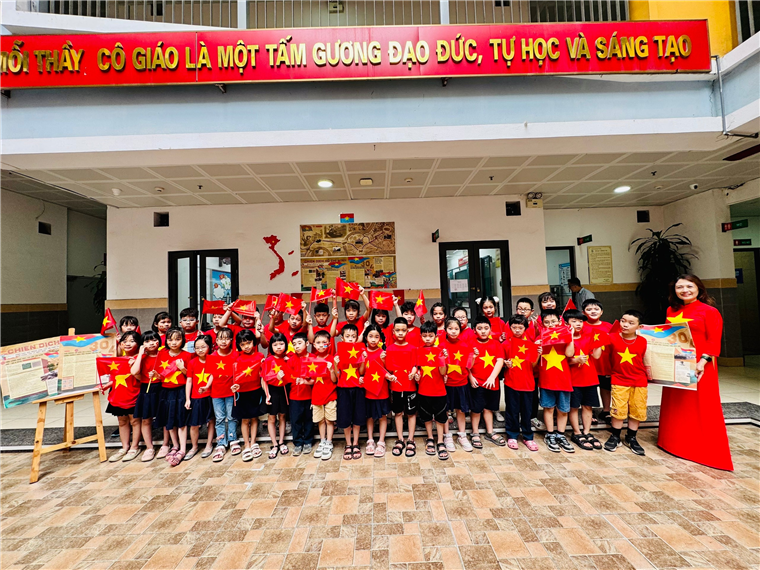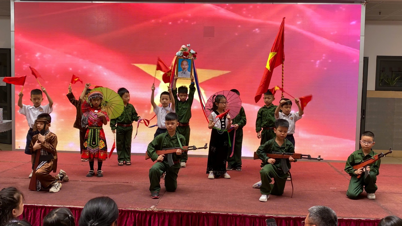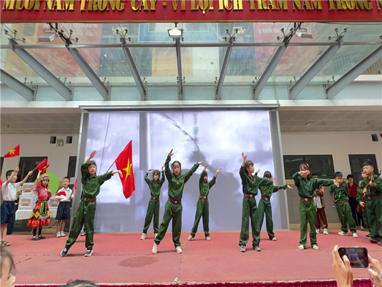 Trong chương trình kỉ niệm, thầy cô và các học sinh nhà trường đã cùng hoà mình với những giai điệu tự hào, những khúc ca đi cùng năm tháng của “ Bác cùng chúng cháu hành quân” với chiến sĩ nhỏ lớp 1B.