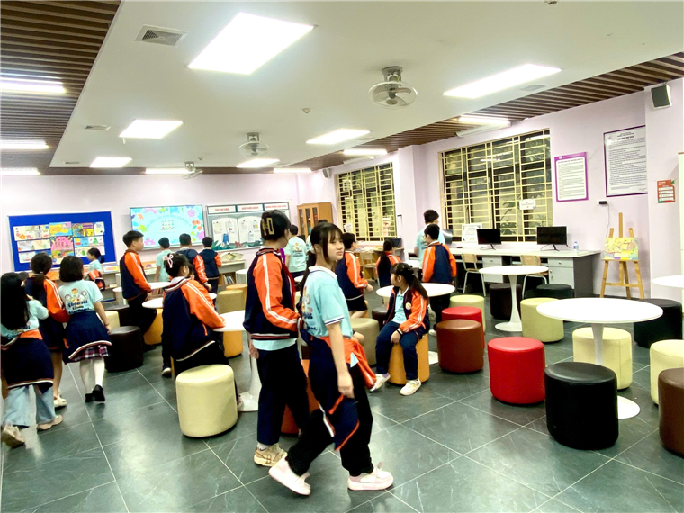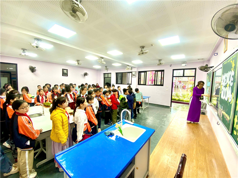 Để tận mắt nhìn thấy các lớp học, các phòng chức năng, các khu thể thao, nơi sinh hoạt bán trú, các bạn học sinh khối 5 được chia thành 4 nhóm, theo sự dẫn dắt của các cô giáo, đi tham quan từng nơi. Các bạn nối theo nhau đi vòng quanh các khu tầng Một: nhà ăn, khu căng tin, phòng thư viện, … Nơi nào đi qua, các bạn ấy cũng đều có những bình luận thật vui: “Ôi mùi thức ăn thơm thế! Oa căng tin gì mà hiện đại vậy! Có tới 10000 đầu sách cơ à !…”