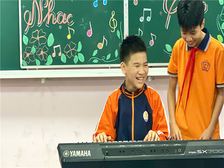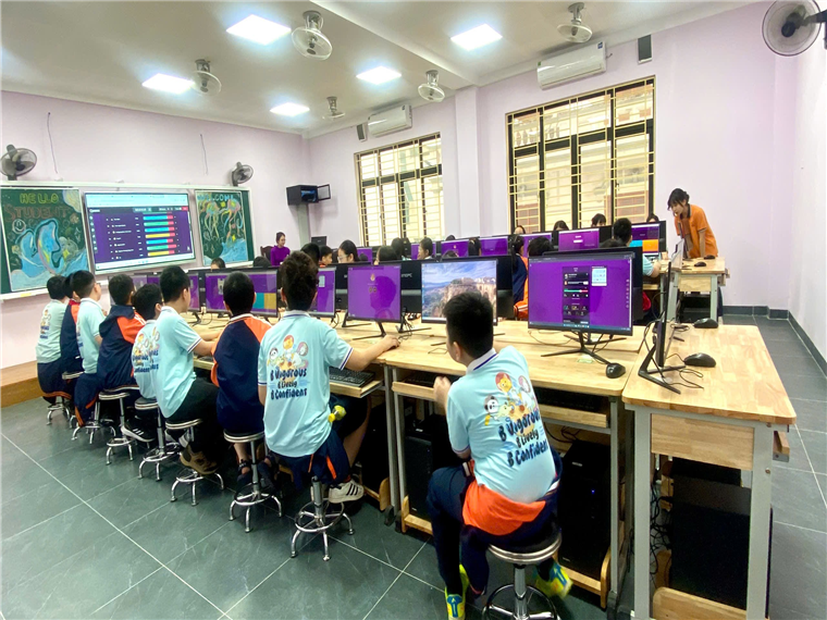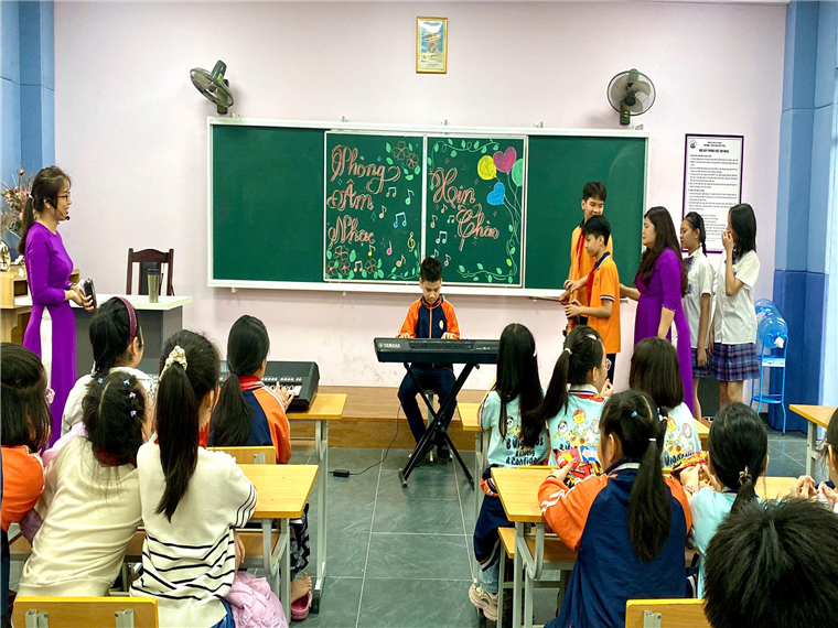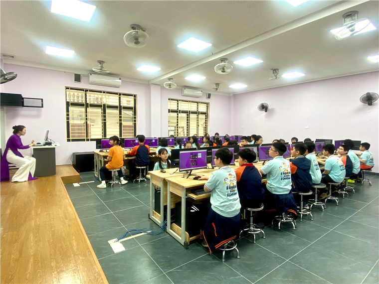 Sự ngạc nhiên và phấn khích càng tăng lên khi các bạn ấy lên tầng 2, tầng 3. Ở đó, các bạn học sinh lớp 5 được tham quan các phòng chức năng với các thiết bị hiện đại, đầy đủ theo bài học, môn học. Phòng Tin học, các bạn được trải nghiệm trò chơi trên máy tính do chính học sinh của trường viết ra. Phòng Tiếng Anh, phần mềm quizzi đã cho các bạn nhỏ một trò chơi thử tài với vốn tiếng Anh, phản xạ nhanh và tư duy linh hoạt. Các bạn được xướng danh trong top 5 nhận quà cười tít mắt. Niềm vui lấp lánh trong bao ánh mắt, chắc hẳn các bạn ấy đang thấy mình được học tập trong môi trường mơ ước. Đón các bạn vào phòng âm nhạc là 2 nhạc công nhí (xin bật mí: 2 nhạc công nhí đều là học sinh cũ của Trường Phan Chu Trinh nhà ta đấy nhé!). Tiết mục đánh đàn oóc-gan và kéo violon với giai điệu hot “Đi dưới trời rực rỡ” đã khiến căn phòng trở thành sân khấu khi các bạn học sinh đồng thanh cất tiếng hát say sưa hòa cùng tiếng đàn điêu luyện của hai nhạc công.