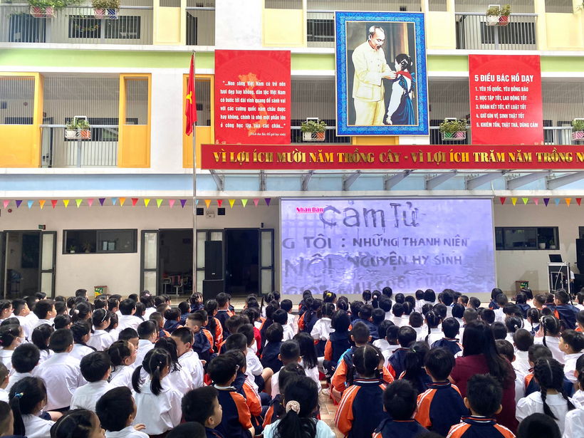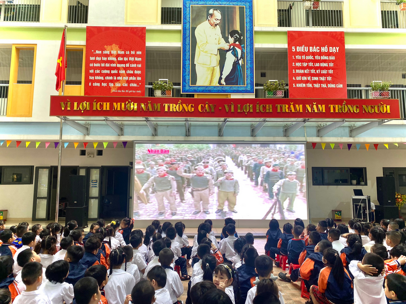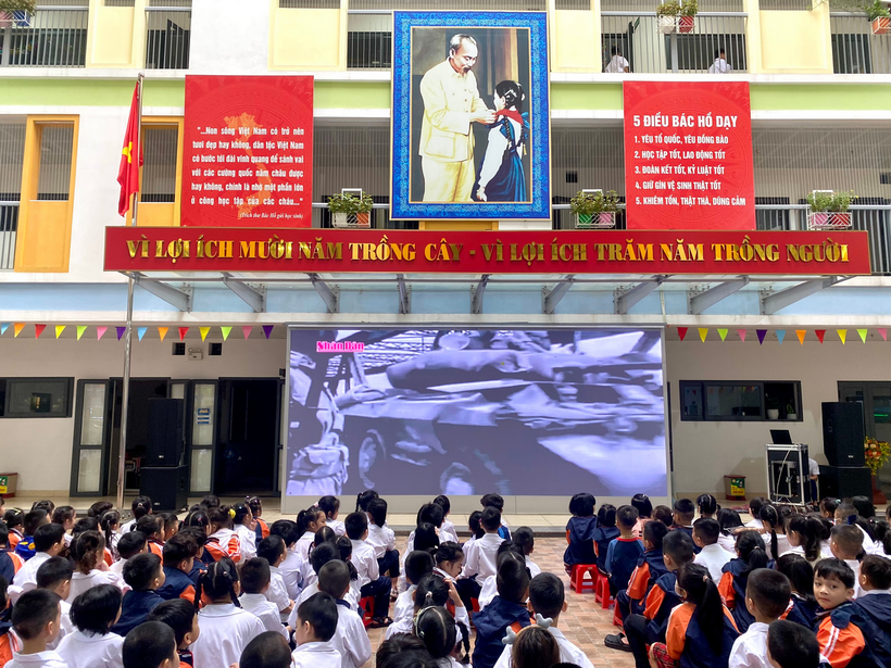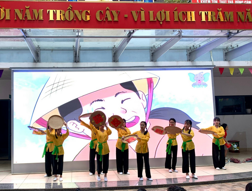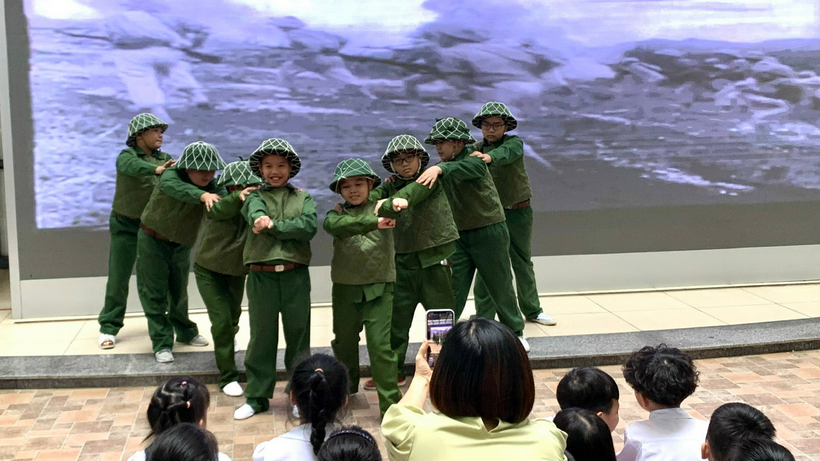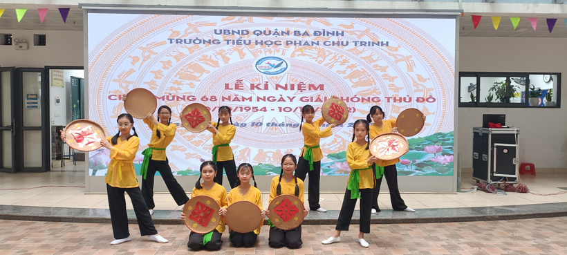 Liên đội nhà trường đã tuyên truyền, cung cấp những thước phim tư liệu lịch sử và tổ chức các tiết mục văn nghệ để tái hiện lại rõ nhất chặng đường lịch sử này. Tiếp sau là các tiết mục văn nghệ của học sinh lớp 5E với liên khúc múa hát: “ Đoàn vệ quốc quân”, “Hạt gạo làng ta”, “Tiến về Hà Nội”.