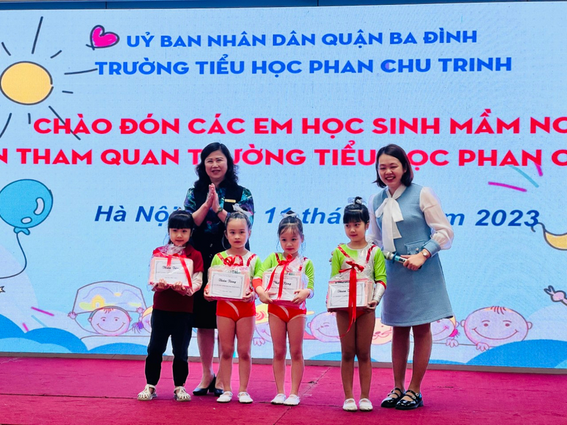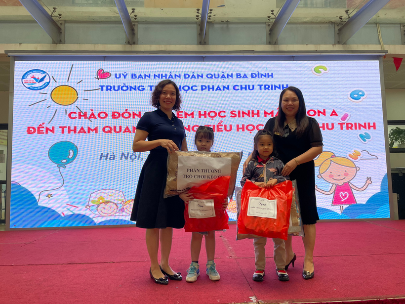 Các em được nghe cô giáo Hoàng Thị Lan Hương - Hiệu trưởng trường TH Phan Chu Trinh giới thiệu về ngôi trường khang trang, hiện đại với truyền thống dạy tốt, học tốt; học sinh trường TH Phan Chu Trinh luôn đoàn kết, tự tin, toả sáng. Cô giáo cũng gửi tặng những món quà nhỏ tới các em học sinh trường Mầm non A và chúc các em sẽ luôn cố gắng trở thành con ngoan, trò giỏi.