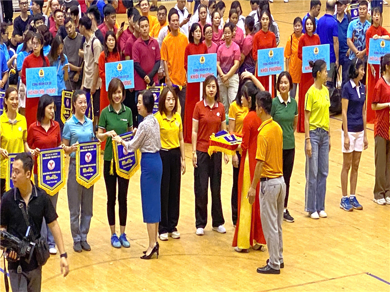 Bà Bùi Phương Chi – Chủ tịch LĐLĐ Quận, Bà Nguyễn Thị Nhàn – Phó chủ tịch LĐLĐ Quận trao huy chương cho các vận động viên đạt giải.