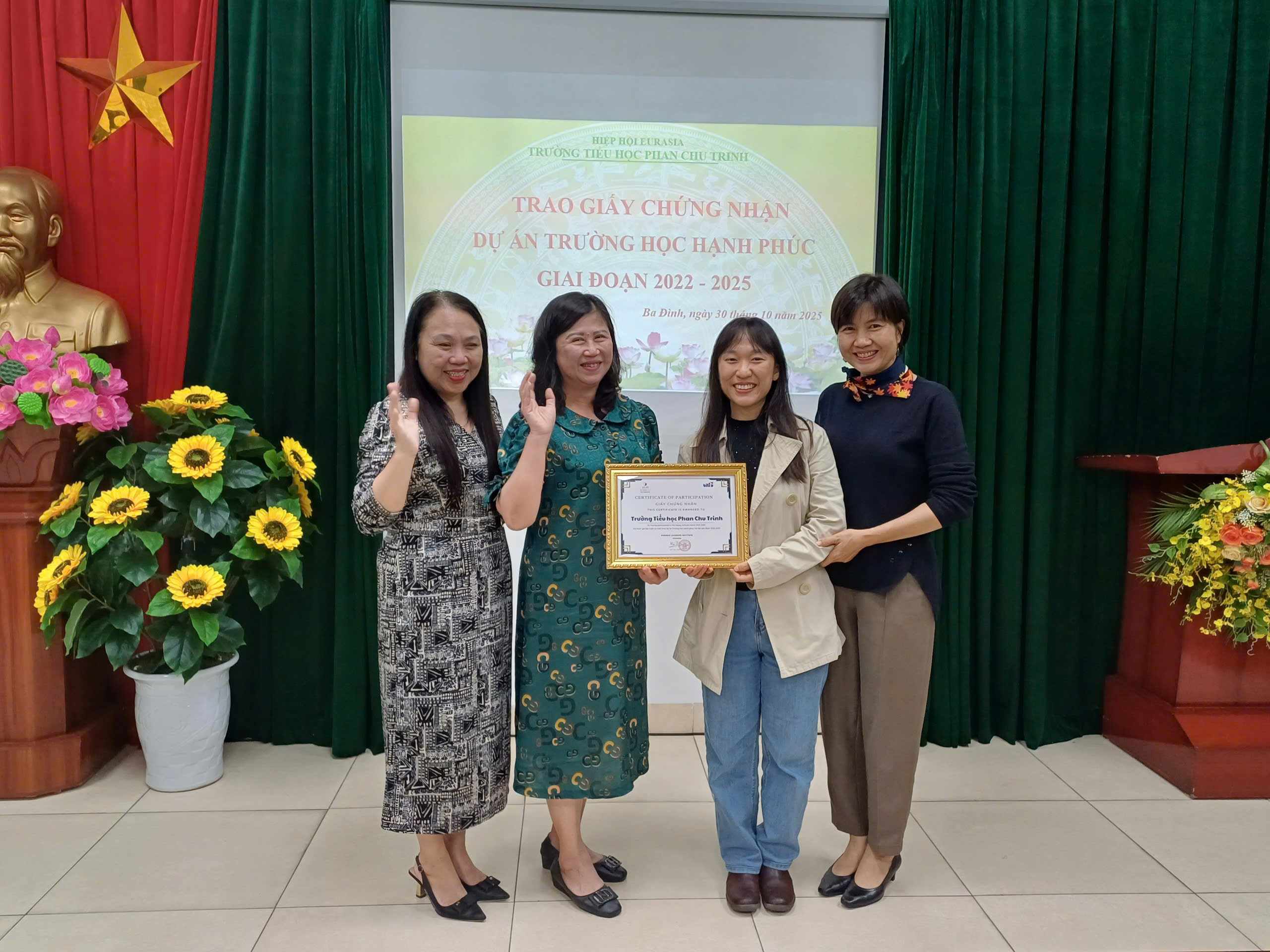 Ngày 30/10/2025, trong không khí ấm áp và đầy ý nghĩa, tập thể cán bộ, giáo viên Trường TH Phan Chu Trinh đã vinh dự đón nhận Giấy chứng nhận hoàn thành Dự án “Trường học Hạnh phúc” giai đoạn 2022–2025 do Tổ chức Eurasia (ELI) trao tặng.