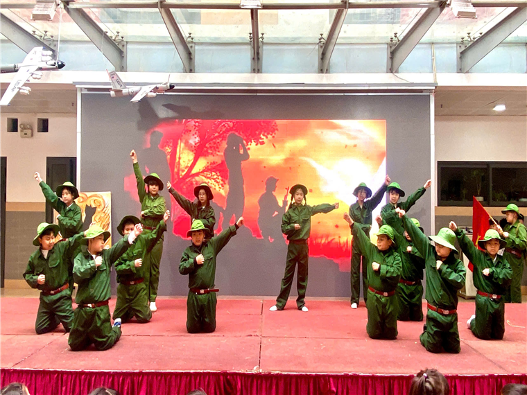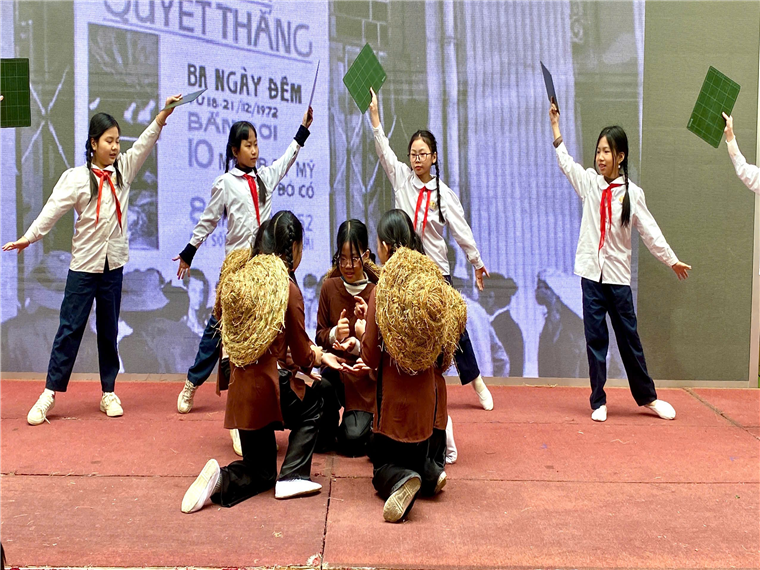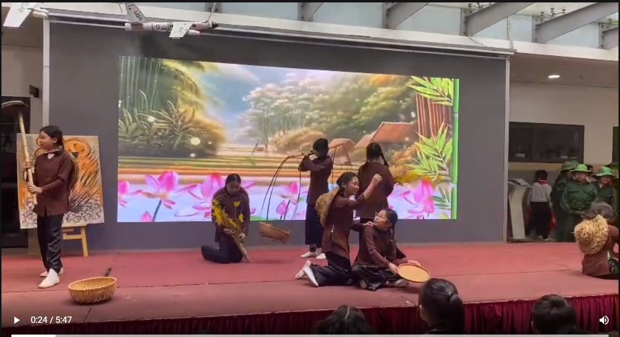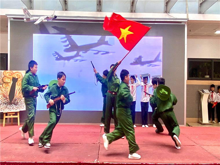 Để tái hiện lại phần nào một thời kì kháng chiến chống Mỹ đầy tiếng bom rơi đạn nổ, tập thể lớp 5C đã trình diễn một hoạt cảnh đầy hấp dẫn, được luyện tập miệt mài dưới sự dẫn dắt tâm huyết của cô tổng phụ trách Trần Huyền Nhung, trên sân khấu bài trí đầy nghệ thuật của thầy giáo Đặng Thanh Hà. Màn trình diễn đã mở ra một khung cảnh chiến tranh mà các học sinh ngày nay chưa từng biết đến: những chiếc mũ rơm gắn với tuổi thơ đi học, đi làm, những hầm chữ A rải rác khắc mọi con đường, những giao thông hào nhộn nhịp bước chân người tránh bom đạn, … Các em nhỏ theo dõi không chớp mắt những điệu múa, lời ca của các anh chị thể hiện những hoạt động đang diễn ra thời kì đó qua các hoạt cảnh dựa trên nền nhạc và các bài hát đã đi cùng năm tháng không quên: Tiễn thầy đi bộ đội, Màu áo chú bộ đội, Hạt gạo làng ta, ….