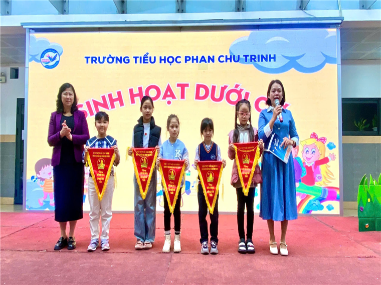 Sau đó, cô Phan Thị Phi Nga - Hiệu phó nhà trường, đã tiếp tục trao cờ thi đua cho các lớp đạt thành tích tốt, khích lệ tinh thần học tập và phấn đấu của các em học sinh.