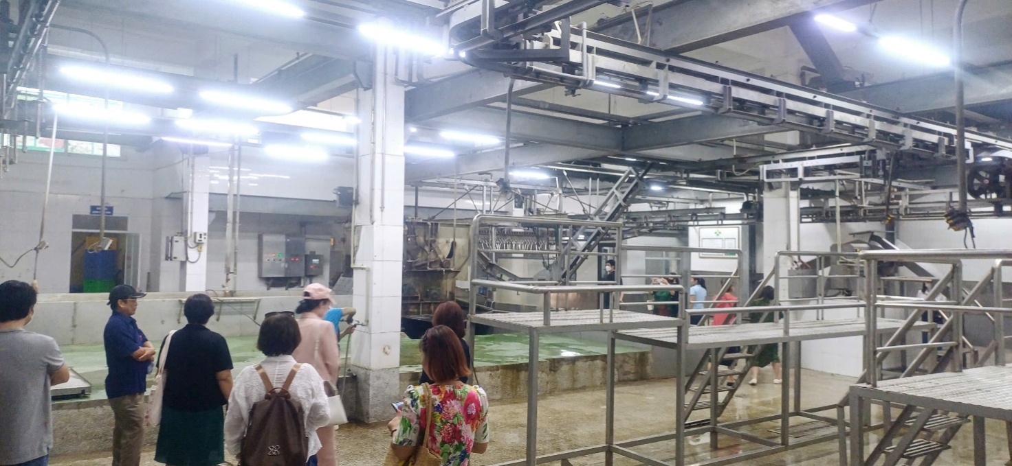 Đoàn vào thăm dây chuyền mổ lợn. Các khu vực sản xuất đều được đoàn xem xét, quan sát kĩ lưỡng kết hợp trao đổi với công nhân, cán bộ quản lý để hiểu và đánh giá về mức độ yên tâm, tin tưởng đối với công ty.