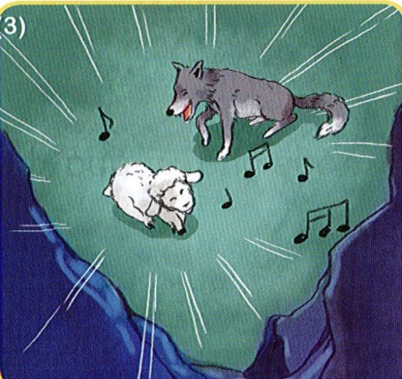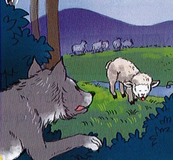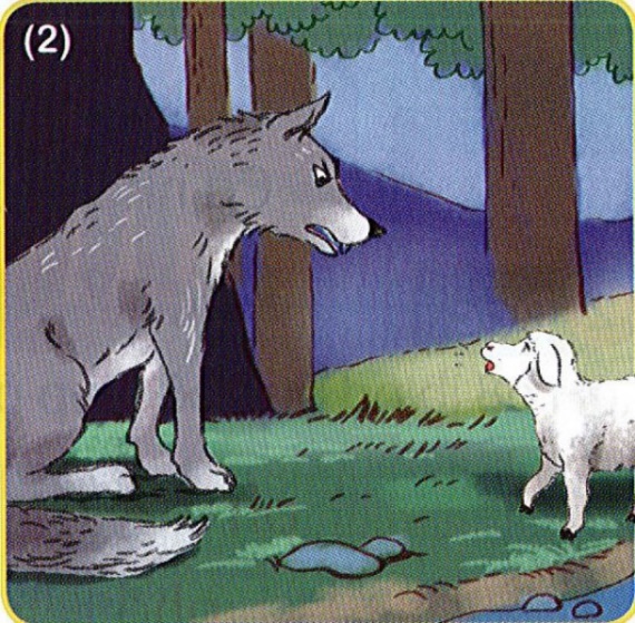 Ngay lúc đó, Sói nhanh chân nhảy ra đứng trước mặt Cừu non. Vừa trông thấy Chó Sói với cặp mắt đỏ khè như hai hòn lửa, Cừu non hoảng hồn. Nhưng Cừu non đã kịp thời nén được sợ hãi, ung dung bước tới trước mặt Sói và nói: