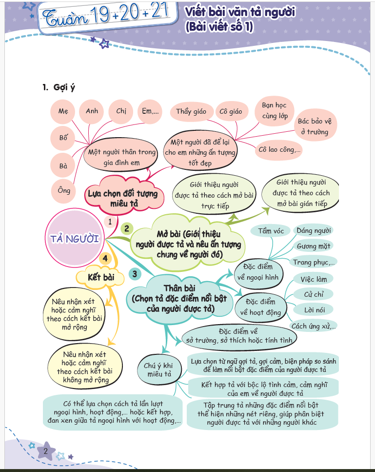 Các bạn học sinh lớp 5 thân mến! Sang học kì 2 chúng mình sẽ học cách viết bài văn tả người. Chúng mình sẽ thường gặp một số khó khăn: có bạn không biết chọn từ ngữ sao cho hay, có bạn lại hơi khó khi kết hợp tả ngoại hình với tính cách để bài văn thật hấp dẫn, có bạn băn khoăn chưa biết sắp xếp các ý sao cho mạch lạc... Nhưng nhờ sơ đồ tư duy những khó khăn đó không còn quá đáng sợ nữa các bạn ạ. Mời các bạn cùng tham khảo sơ đồ tư duy dưới đây. Mình tin rằng, với sự luyện tập và sáng tạo, chúng mình sẽ viết được những bài văn thật hay để kể về những người thân yêu xung quanh mình.