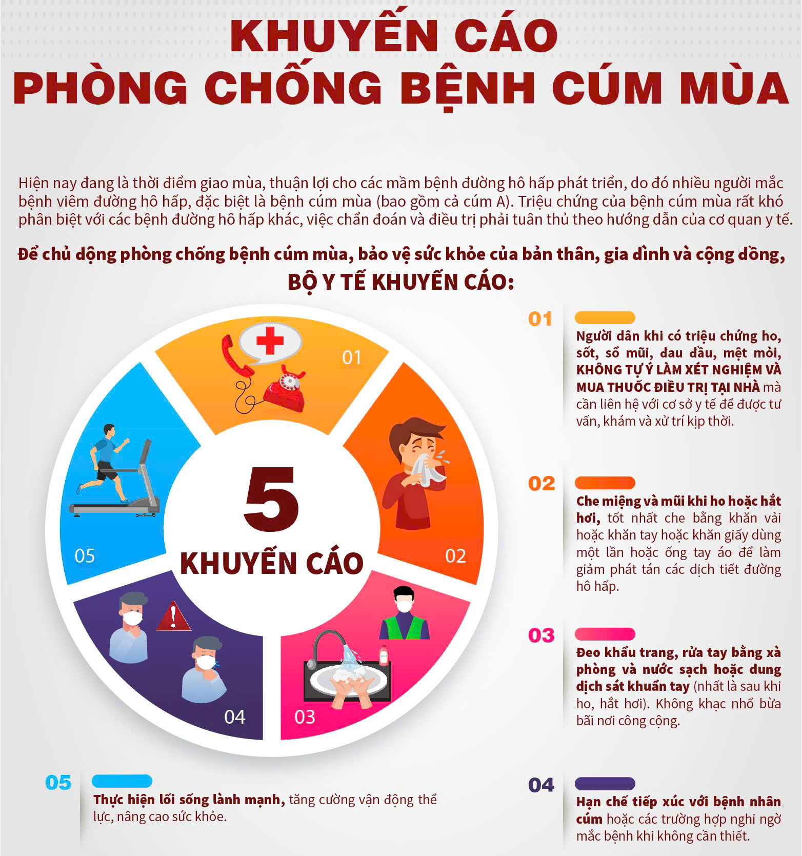Hiện nay đang là thời điểm giao mùa, thuận lợi cho các mầm bệnh đường hô hấp phát triển, do đó nhiều người mắc bệnh viêm đường hô hấp, đặc biệt là bệnh cúm mùa (bao gồm cả cúm A). Triệu chứng của bệnh cúm mùa rất khó phân biệt với các bệnh đường hô hấp khác, việc chẩn đoán và điều trị phải tuân thủ theo hướng dẫn của cơ quan y tế. Để chủ động phòng chống bệnh cúm mùa, bảo vệ sức khỏe của bản thân, gia đình và cộng đồng, Bộ Y tế khuyến cáo: