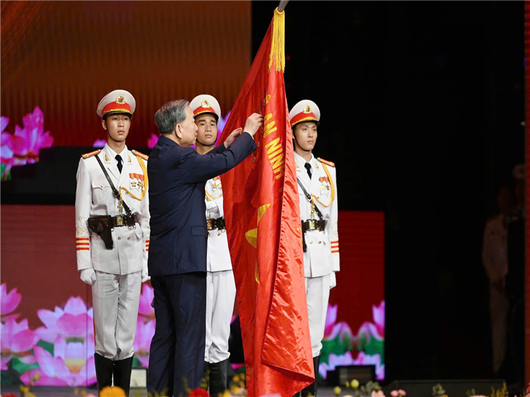 Tổng Bí thư Tô Lâm gắn Huân chương Sao Vàng lên cờ truyền thống của Lực lượng Công an Nhân dân