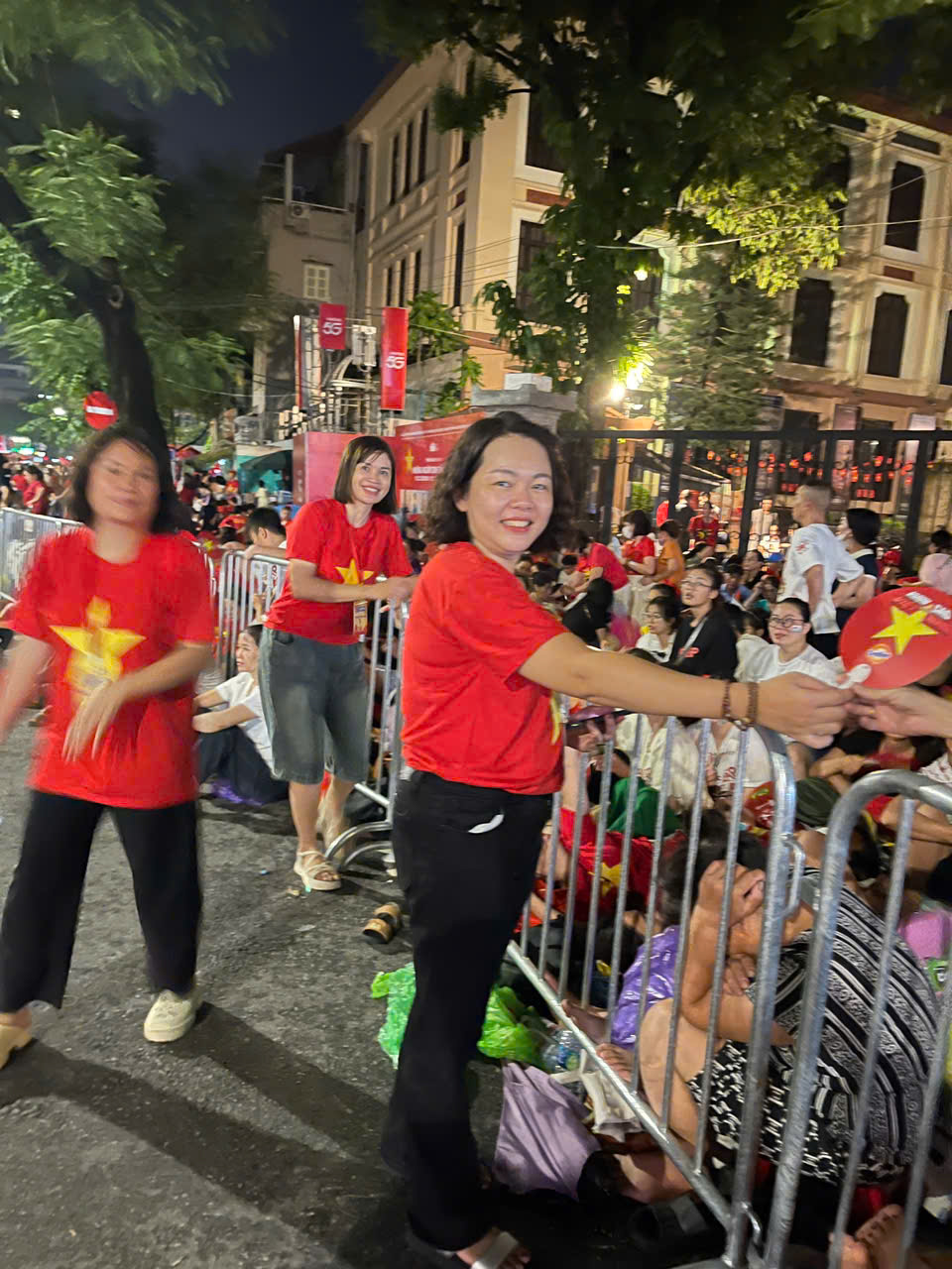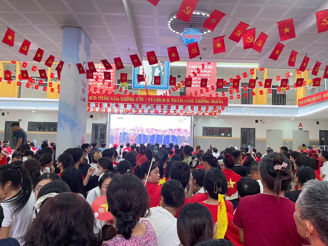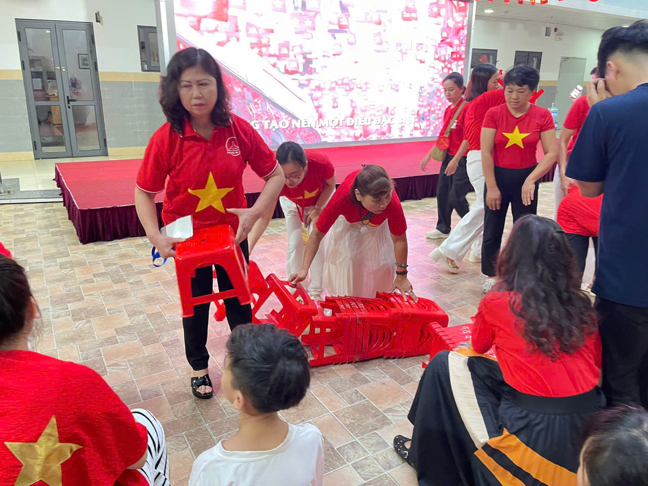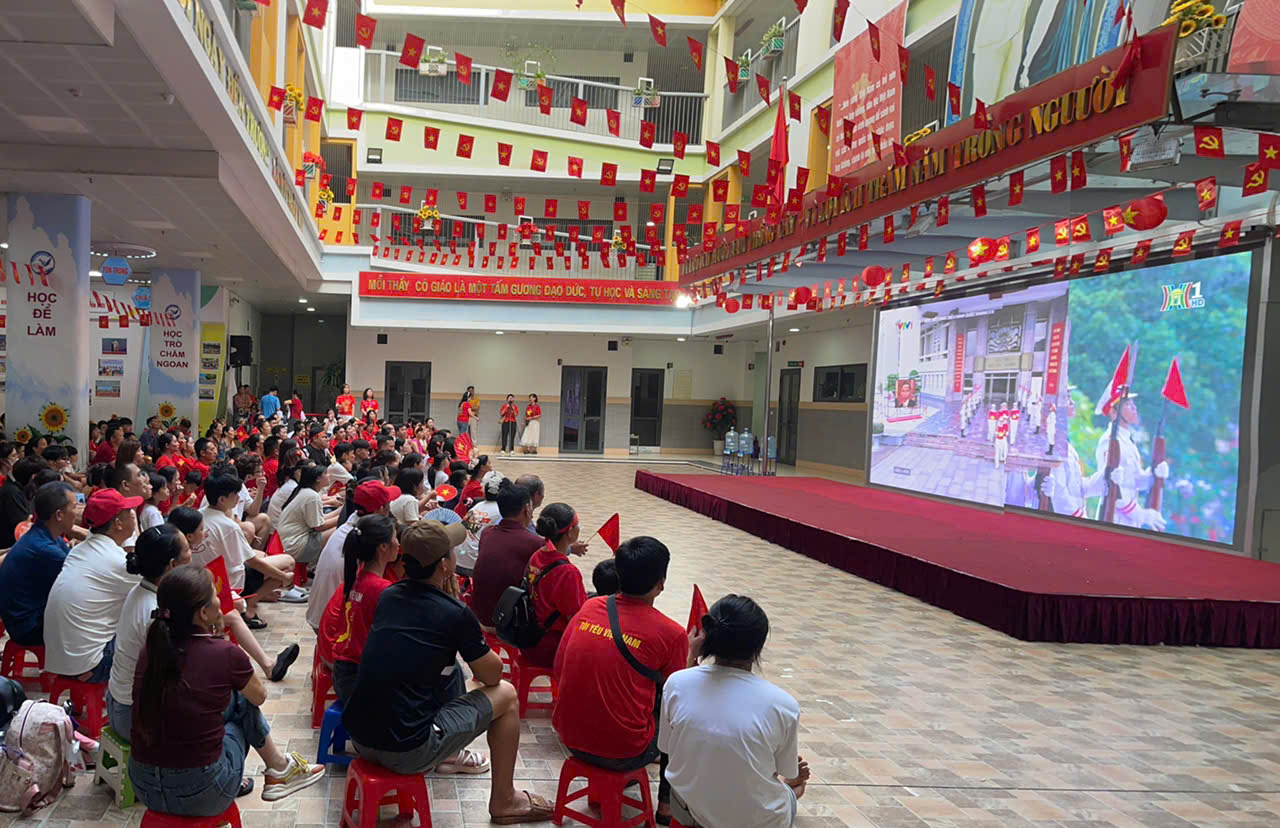 Không phải ai cũng có điều kiện trực tiếp chứng kiến lễ diễu binh, diễu hành tại quảng trường Ba Đình, nhà trường đã phối hợp tổ chức điểm chiếu màn hình LED để nhân dân được xem truyền hình trực tiếp trong bầu không khí trang nghiêm, tràn đầy tự hào. Từng khoảnh khắc trên màn hình lớn – từ những bước chân oai hùng của đoàn quân đến hình ảnh cờ đỏ sao vàng tung bay phấp phới – đã làm rưng rưng biết bao ánh mắt. Người dân đã được sống trong không khí của Đại lễ ngay tại điểm trường, ai cũng chan chứa niềm xúc động, tự hào về Tổ quốc. Những chai nước mát, bánh ngọt, hộp sữa… tuy giản dị nhưng chứa đựng bao nghĩa tình. Đó là sự sẻ chia chân thành, là tấm lòng biết ơn của thế hệ hôm nay đối với nhân dân – những người luôn đồng hành, dõi theo từng bước đi của đất nước. Mỗi suất quà nhỏ bé trao đi đã góp phần thắp lên niềm vui, mang lại sự tiếp sức để người dân có thể trọn vẹn tham gia, hưởng trọn không khí của Đại lễ. Ngay sau khi lễ diễu binh kết thúc, khi các ngả đường còn chưa mở, sân trường lại trở thành một điểm hẹn văn hóa đầy ấm áp. Những tiết mục văn nghệ giản dị thấm đượm tình yêu quê hương, đất nước đã được thầy trò biểu diễn, gửi tặng bà con. Tiếng hát, điệu múa vang lên giữa không khí rộn ràng của ngày hội, đã tiếp thêm niềm vui, gắn kết nhân dân với nhà trường trong khoảnh khắc thiêng liêng của Đại lễ. Khi dòng người dần rời khỏi sân trường, các thầy cô lại lặng lẽ xếp ghế, thu gom rác, dọn dẹp vệ sinh, trả lại cảnh quan sạch đẹp, gọn gàng. Việc làm giản dị ấy không chỉ thể hiện tinh thần trách nhiệm mà còn gửi đi thông điệp về nếp sống văn minh, ý thức giữ gìn môi trường, để hình ảnh ngôi trường trong ngày Đại lễ thêm đẹp đẽ, đáng trân trọng.