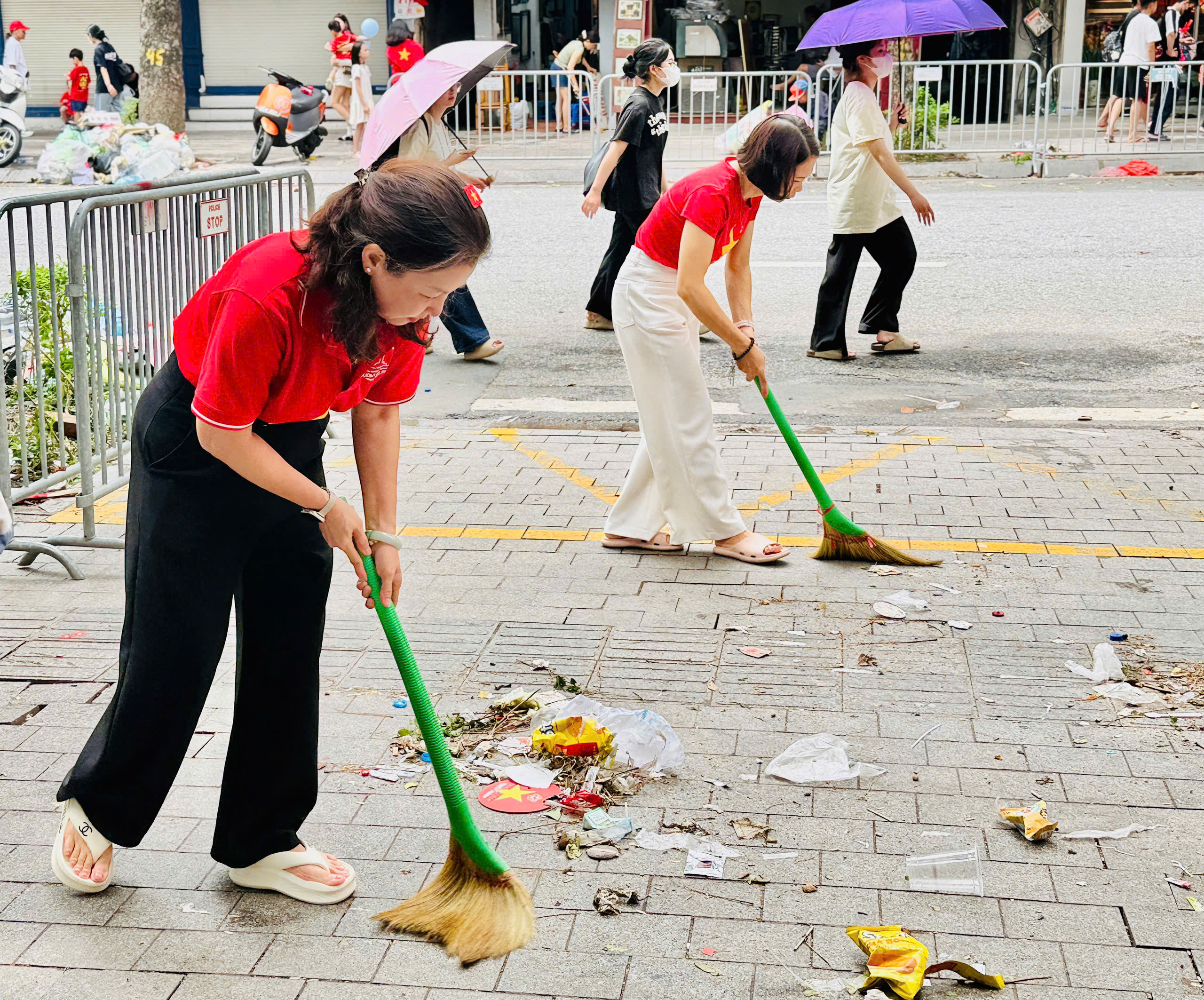 Cán bộ, giáo viên, nhân viên trường Tiểu học Phan Chu Trinh dọn vệ sinh, đảm bảo cảnh quan trong đại lễ A80