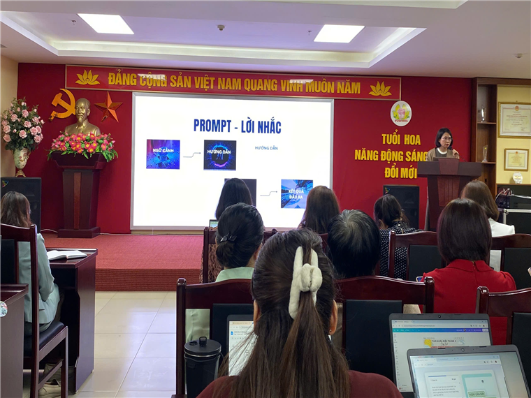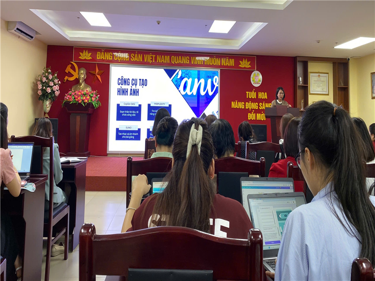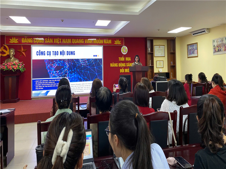 Tại buổi tập huấn, các cán bộ, giáo viên được tiếp cận với các công cụ AI hiện đại như ChatGPT, Canva AI, công cụ tạo ảnh, video và nội dung số phục vụ công tác Truyền thông tại trường học.