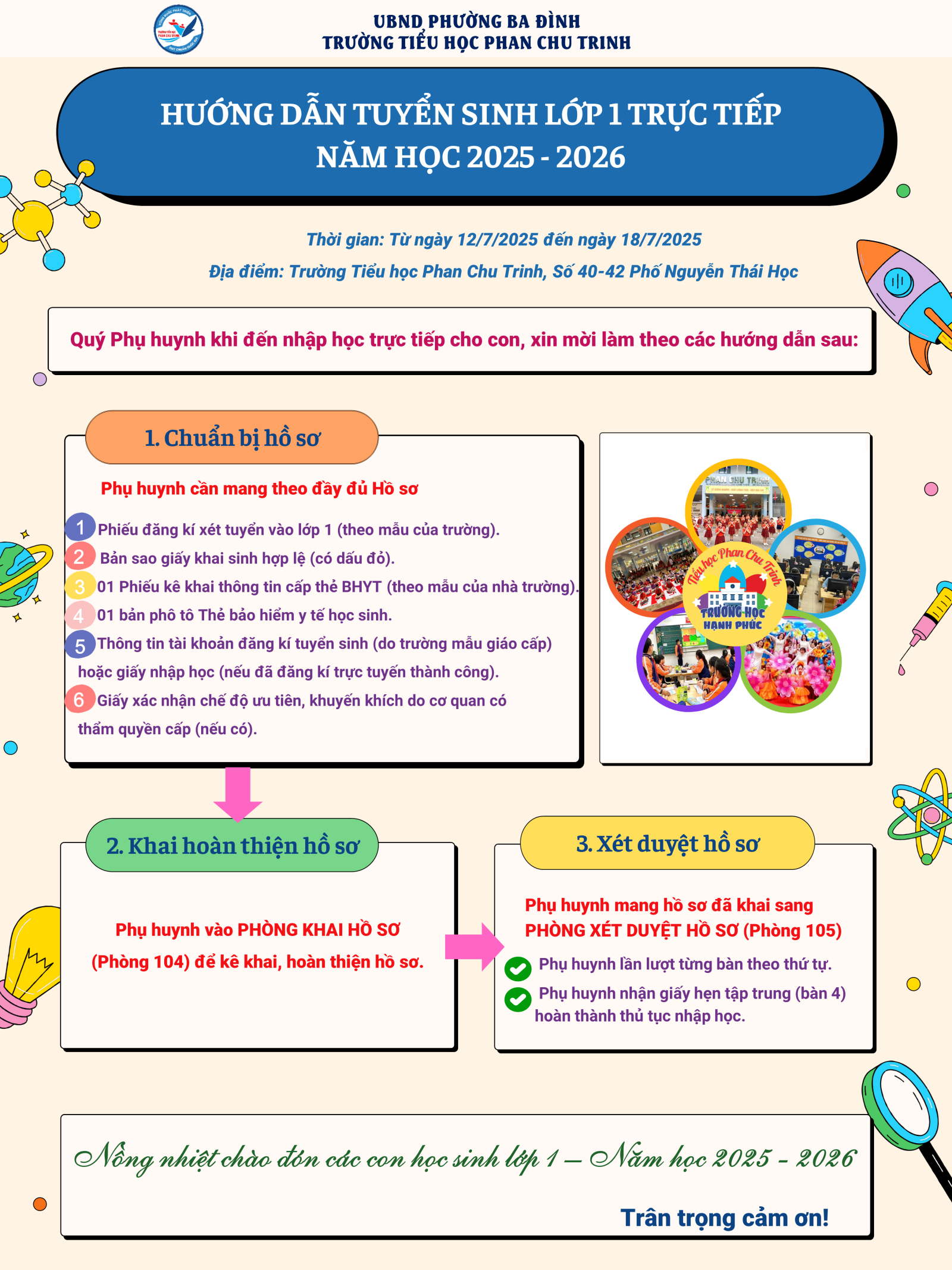 Nhằm tạo điều kiện thuận lợi cho công tác tuyển sinh đầu cấp, Trường Tiểu học Phan Chu Trinh trân trọng thông báo về quy trình tuyển sinh trực tiếp học sinh vào lớp 1 năm học 2025-2026 như sau:
