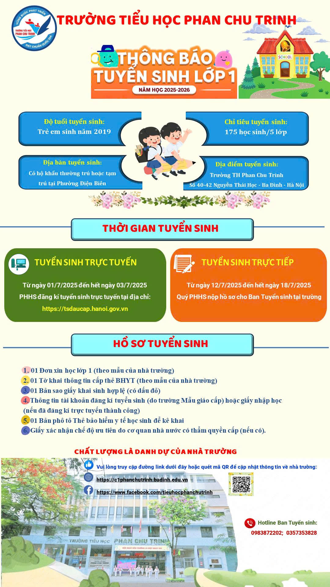Thông báo về công tác Tuyển sinh trực tiếp lớp 1 - Năm học 2025-2026 của trường Tiểu học Phan Chu Trinh – phường Ba Đình, thành phố Hà Nội